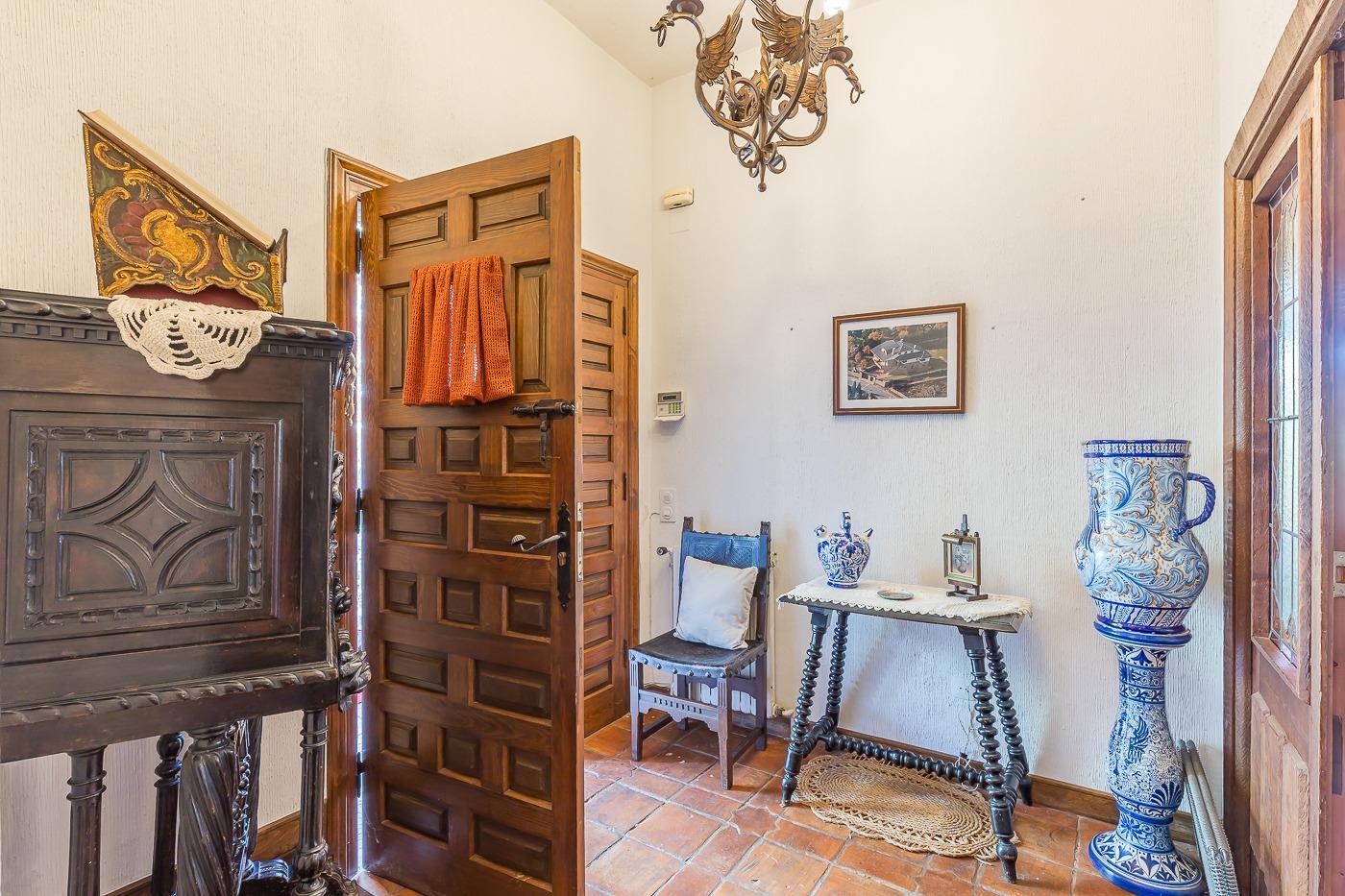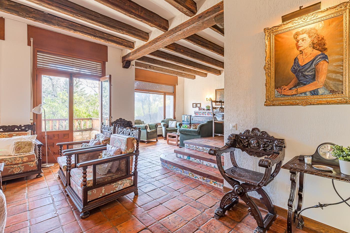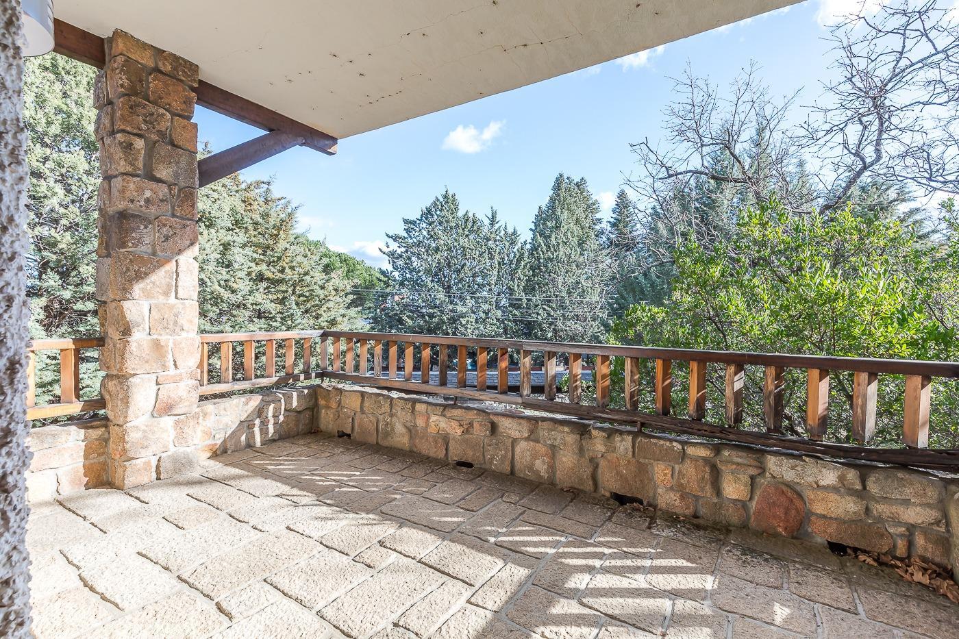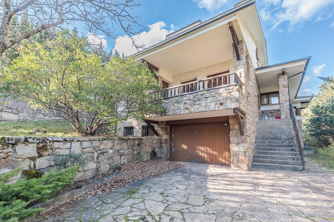 Esta casa unifamiliar se encuentra a la entrada del Pueblo de Navacerrada al lado de su embalse en una parcela individual de 1.326 metros, en su fachada esta la entrada al garaje y una terraza, por el lateral suben unas escaleras hacia la entrada principal por la que entramos a un recibidor desde el que de frente accedemos a un salón comedor con chimenea, acceso a la terraza y acceso también a la amplia cocina con despensa y una habitación secundaria con un baño, este a su vez se le puede dar uso de baño de cortesía. Desde el recibidor tenemos de frente a la derecha otra puerta que separa las escaleras que dan acceso a la planta alta y baja en la que encontramos el garaje, la sala de calderas y un par de estancias de gran tamaño para hacer habitaciones, una bodega, taller, baño, despensa….