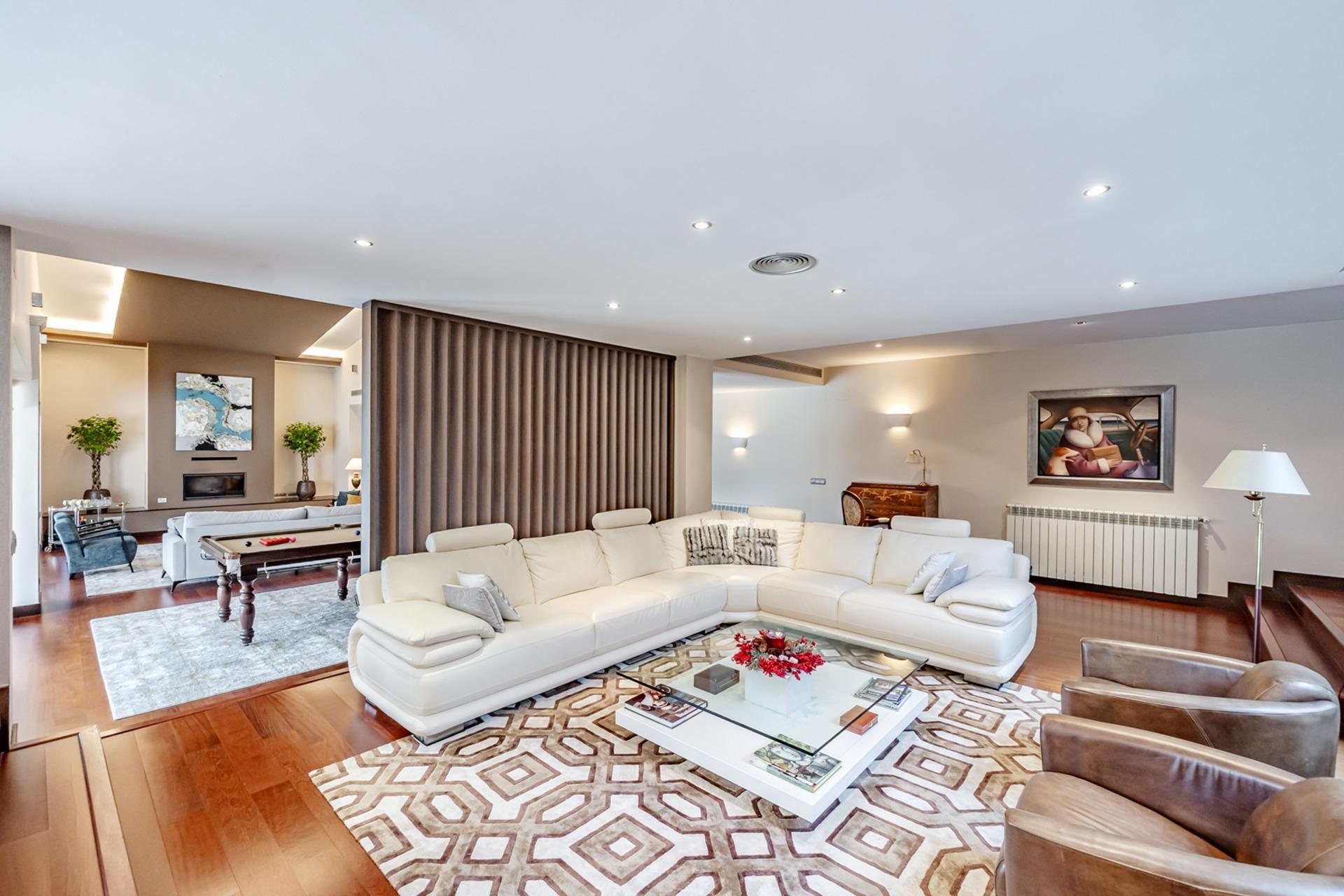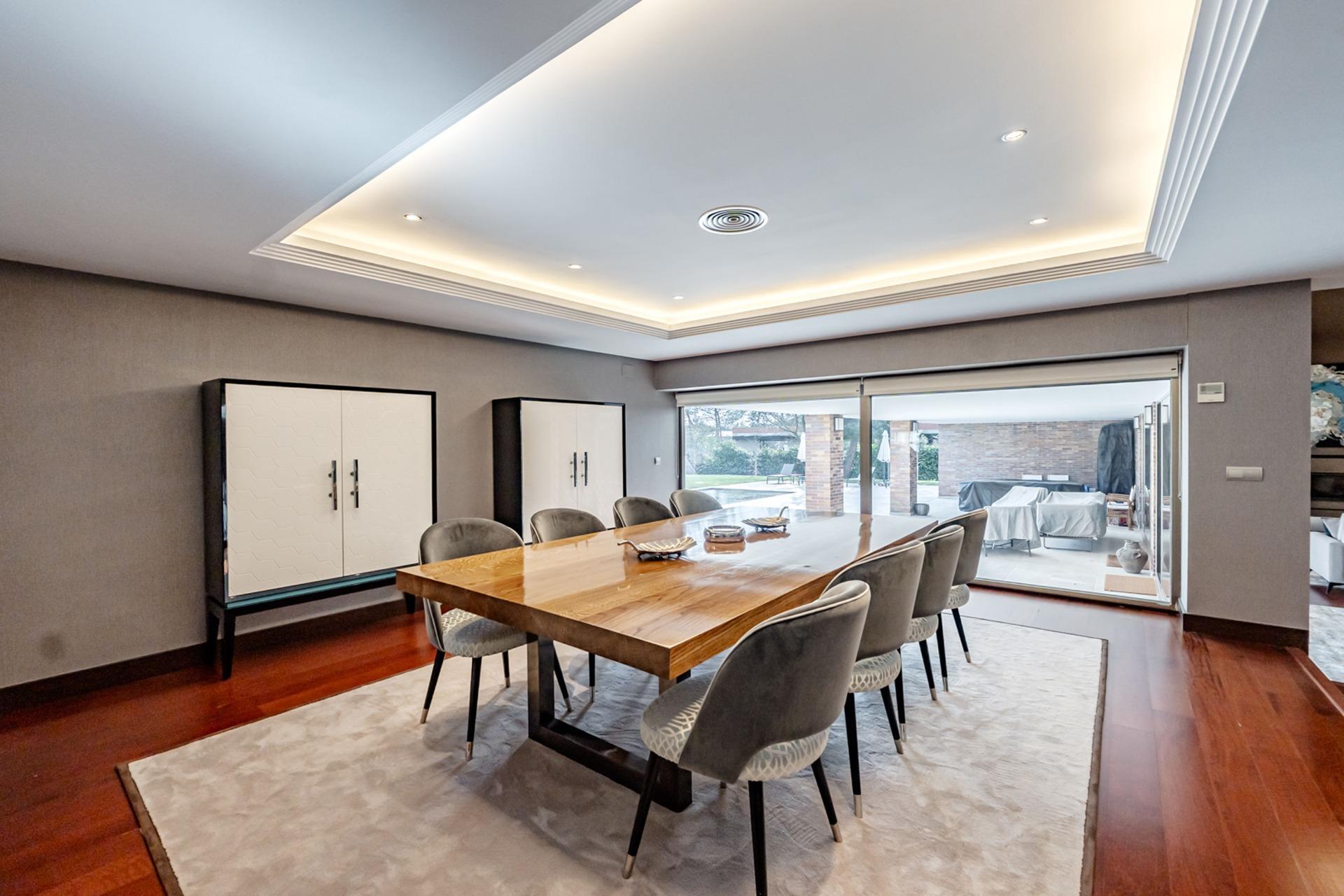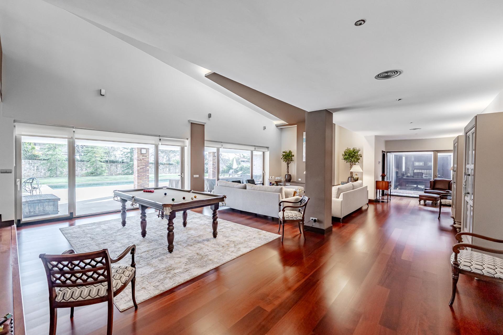 – Salón principal de 152 m² con suelos de madera de cerezo pulida, techos de doble altura con luz indirecta perimetral y puertas correderas que inundan el espacio de luz natural y abren directamente a la terraza y la piscina