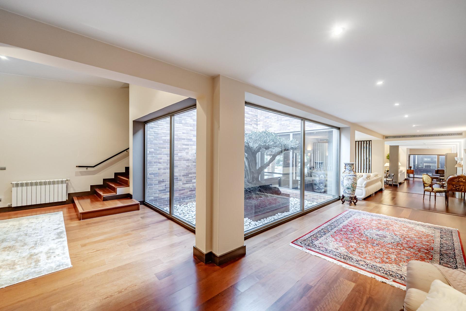 – Patio interior ajardinado con olivo de gran porte como elemento central, visible desde el interior a través de grandes ventanales: un detalle de diseño singular y exclusivo
