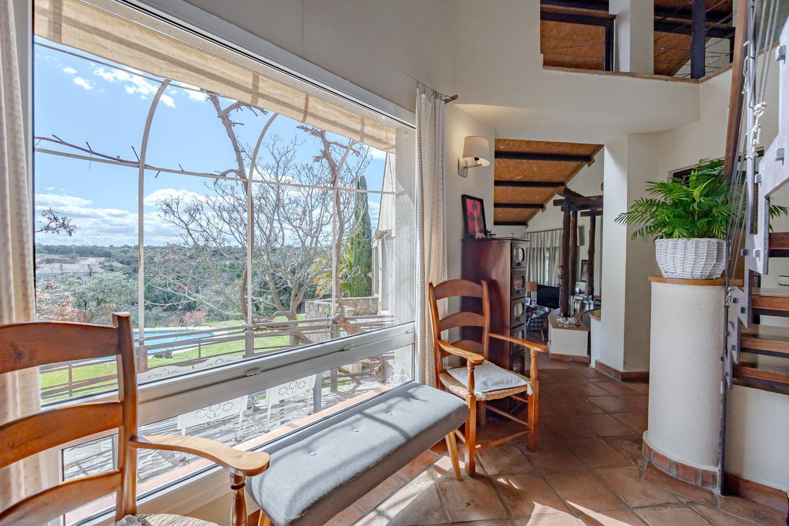 La casa principal se distribuye en una única planta, lo que refuerza su comodidad y habitabilidad. Desde el acceso, el hall marca el inicio de un recorrido fluido y abierto por estancias amplias y bien definidas. El salón principal, con grandes ventanales, se abre al jardín y se articula en torno a una elegante chimenea, generando un ambiente cálido y acogedor. La conexión con el porche y el paisaje circundante convierte este espacio en el verdadero corazón del hogar.