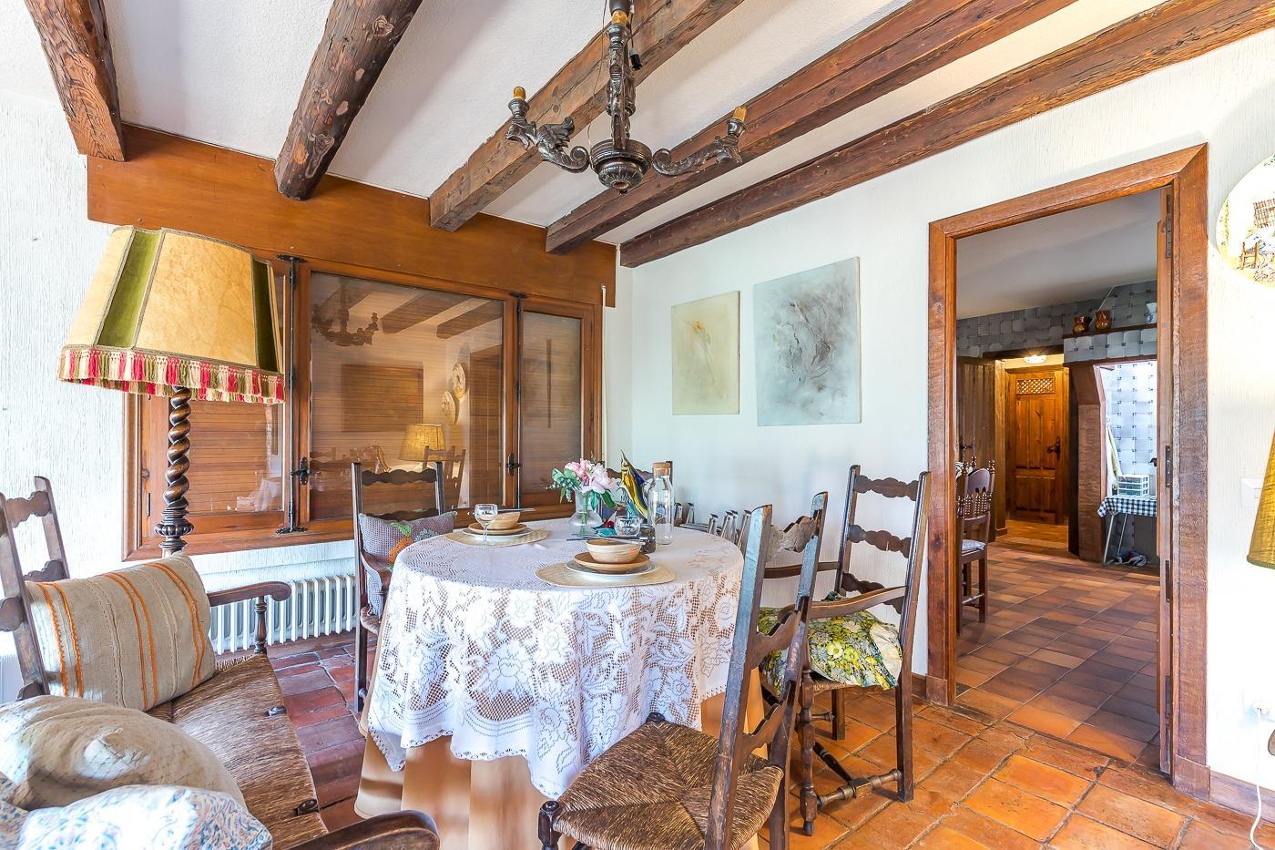 Esta casa unifamiliar se encuentra a la entrada del Pueblo de Navacerrada al lado de su embalse en una parcela individual de 1.326 metros, en su fachada esta la entrada al garaje y una terraza, por el lateral suben unas escaleras hacia la entrada principal por la que entramos a un recibidor desde el que de frente accedemos a un salón comedor con chimenea, acceso a la terraza y acceso también a la amplia cocina con despensa y una habitación secundaria con un baño, este a su vez se le puede dar uso de baño de cortesía. Desde el recibidor tenemos de frente a la derecha otra puerta que separa las escaleras que dan acceso a la planta alta y baja en la que encontramos el garaje, la sala de calderas y un par de estancias de gran tamaño para hacer habitaciones, una bodega, taller, baño, despensa….