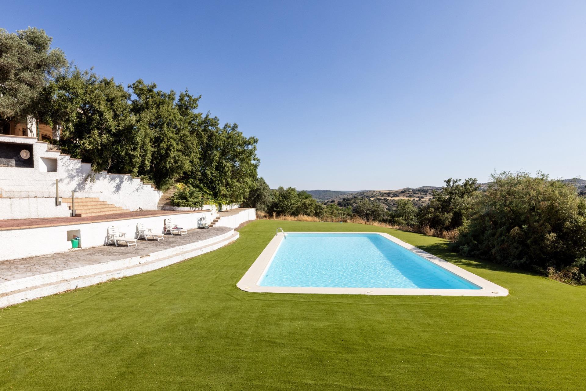 – Jardines: rodeado de arbolado autóctono con encinas, pinos, abetos, parras, ciprés y olivos, crean un entorno natural y tranquilo. Y césped artificial cercano a la piscina.