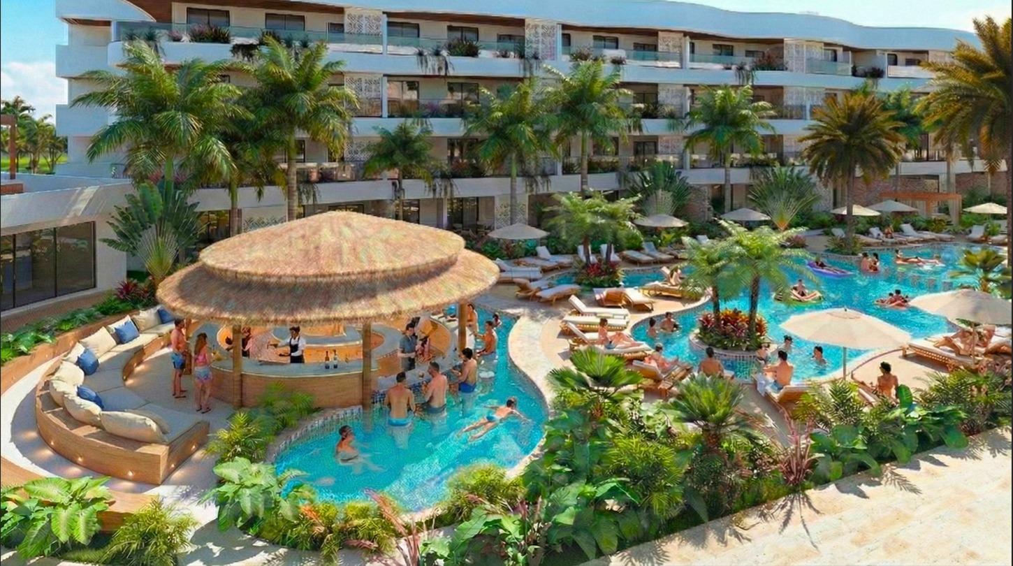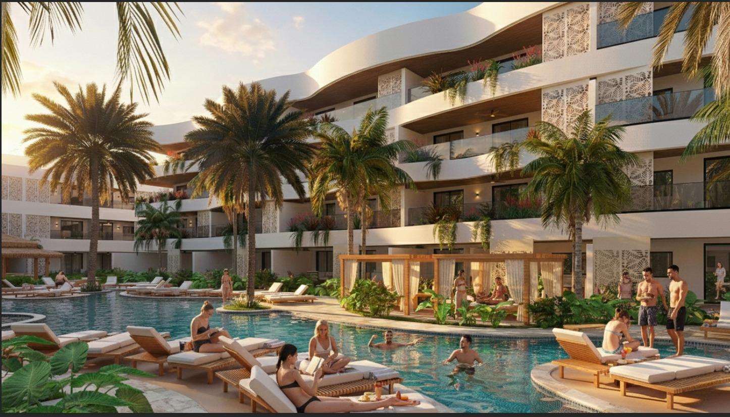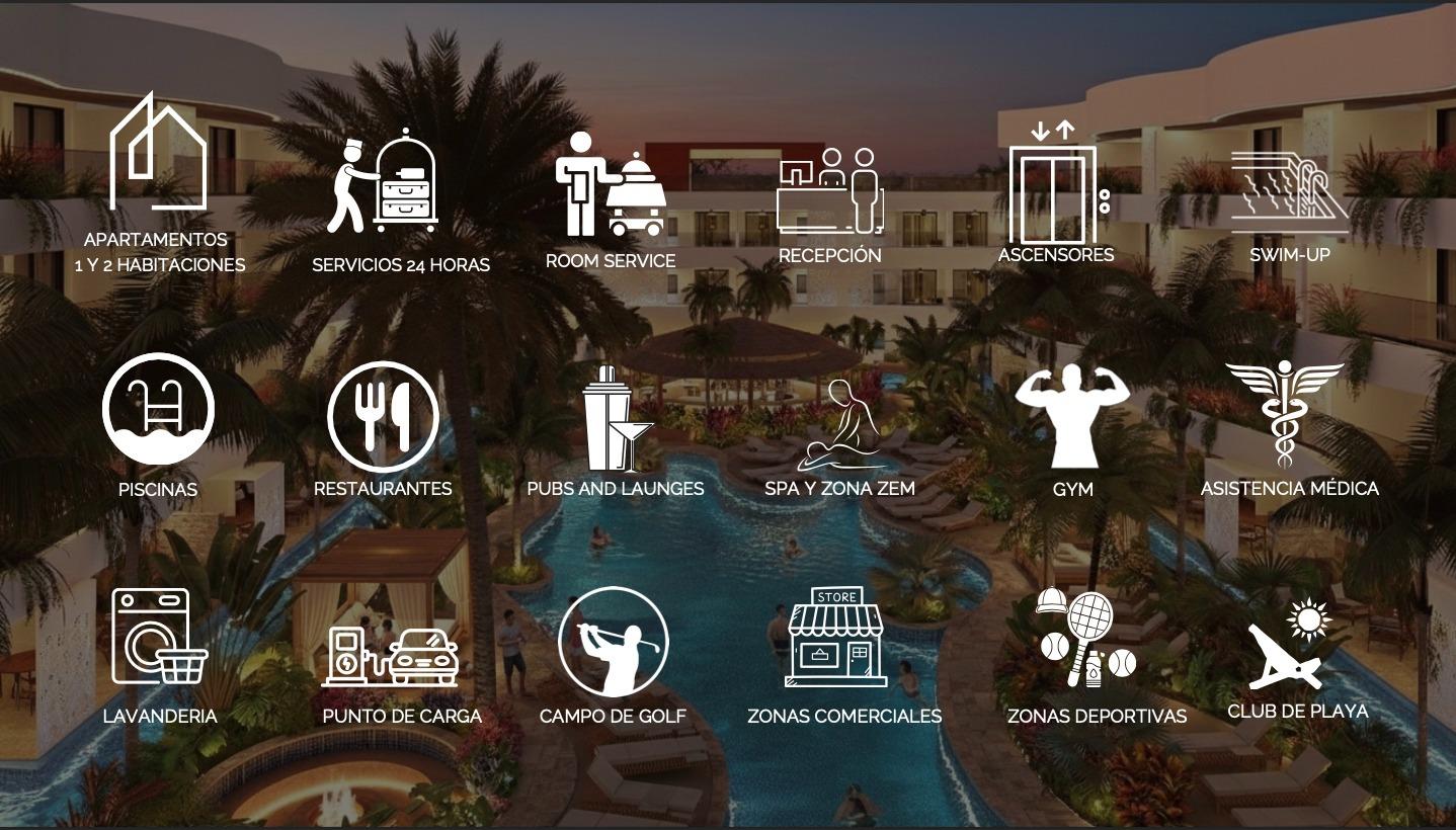 DESCRIPCIÓN DE HABITACIONES Y PROYECTO:~~APARTAMENTO DE UNA HABITACIÓN~~-Área aproximada: 61 – 67 m²~-1 dormitorio~-1 baño~-Sala y comedor amplios~-Cocina equipada~-Terraza privada~-Swim up / Picuzzi~ APARTAMENTO DE DOS HABITACIONES~-Área aproximada: 78 – 129 m²~-2 dormitorios~-2 baños~-Sala y comedor amplios~-Cocina equipada~-Terraza privada~-Swim up / Picuzzi~INFORMACION DEL PROYECTO: ~~-Proyecto inmobiliario tipo condo-hotel ubicado en White Sands, Bávaro Punta Cana~-Complejo residencial tipo Golf & Beach Resort~-2 bloques de edificios residenciales, todos amueblados~-Apartamentos de 1 y 2 habitaciones~-Entrega estimada: Mayo 2028~-Ubicado a pocos minutos de Playa Arena Gorda, Downtown Punta Cana y el Aeropuerto Internacional.~OTROS DATOS (parking? ¿Piscina Año Construcción? Distancia a la playa…~~Amenidades: ~●Parking en el condominio gratuito para los proprietarios de apartamentos~●Habitaciones: Apartamentos de 1, 2 y 3 habitaciones.~●Servicios 24 Horas: Atención y soporte continuo.~●Room Service: Servicio de comida y atención a la habitación.~●Recepción: Lobby de bienvenida para huéspedes y propietarios.~●Ascensores: Acceso rápido a todos los niveles.~●Piscinas: 2 Áreas de nado y recreación acuática.~●Restaurante: Gastronomía dentro del complejo.~●Pubs and Lounges: Espacios sociales para tragos y relajación.~●Spa: Servicios de bienestar y masajes.~●Gym: Gimnasio totalmente equipado.~●Lavandería: Área de lavado y secado.~●Punto de Carga: Estaciones para vehículos eléctricos.~●Asistencia Médica: Servicio de salud en el sitio.~●Club de Playa: Acceso exclusivo frente al mar. Localizado en Costa de Arrecife~●Transporte: Facilidades de traslado y movilidad.~●Campo de Golf: Accesible para los invitados del condominio~●Acceso al Casino: Casino Avalon~Distancia a la playa: 7 minutos en coche a la Playa White Sands~Año de entrega: 2028~~