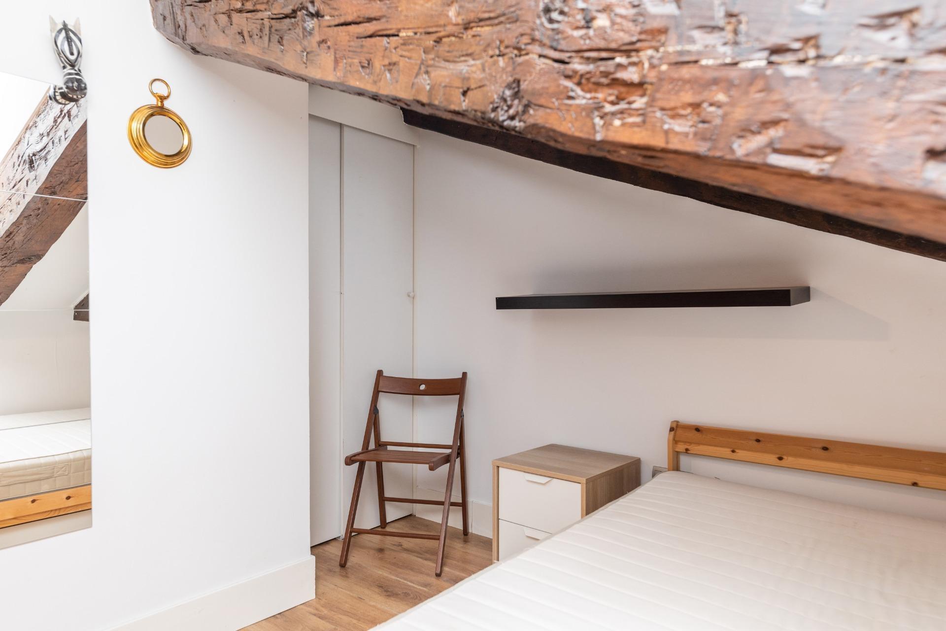 Este estudio está abuhardillado y tiene vistas las vigas de madera. La paredes son lisas pintadas en blanco y el suelo es de tarima. Cuenta con bomba de frío/calor para la climatización y termo eléctrico para el agua caliente.