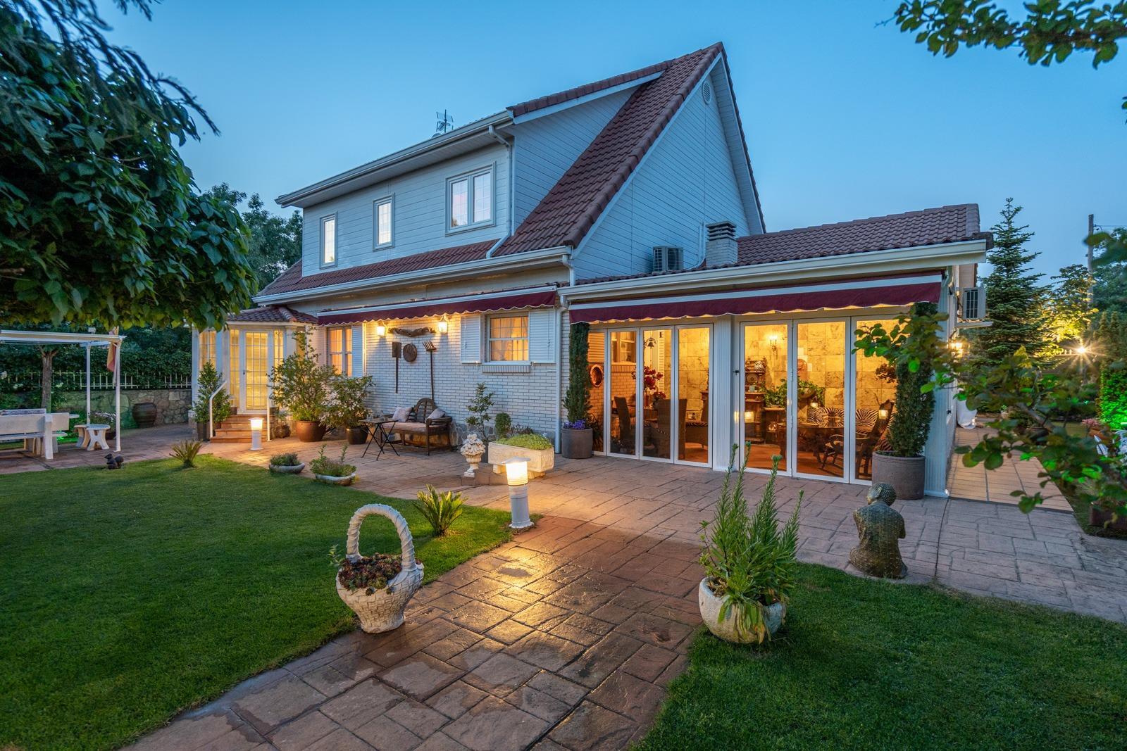El exterior de la vivienda es una auténtica joya: un jardín consolidado, cuidado con mimo, rodeado de vegetación, con zona de relax con jacuzzi, barbacoa cubierta, zona chillout, y dos edificaciones independientes. Una de ellas está acondicionada como zona de spa o descanso con jacuzzi, y la otra como despacho profesional o estudio, ideal para teletrabajo o proyectos personales.