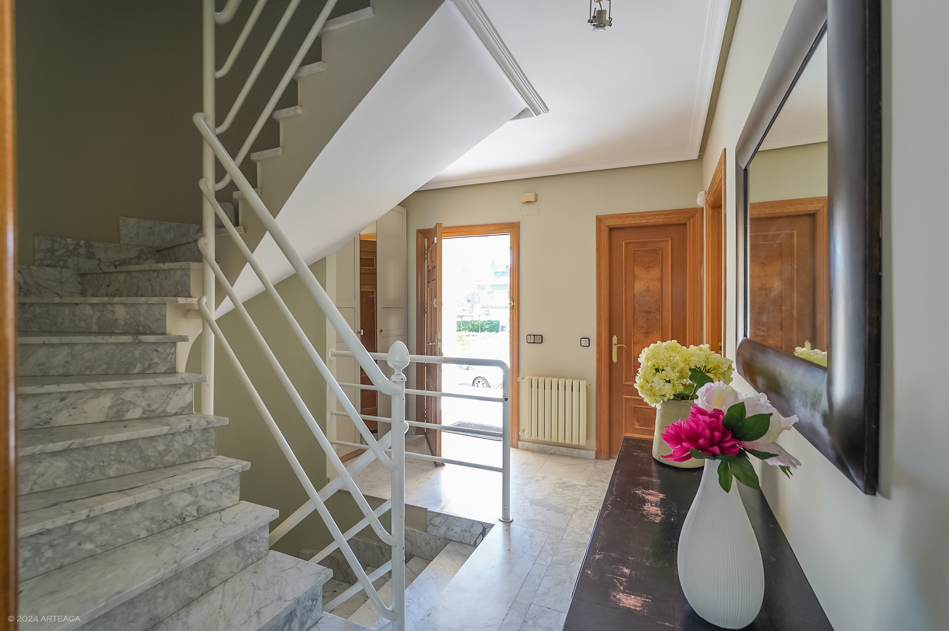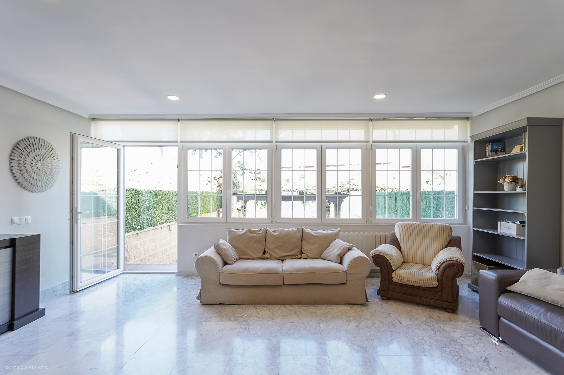 Planta Sótano: Garaje con espacio para dos coches y acceso directo a la vivienda. En esta planta encontramos además una sala de 25 m2 con chimenea y luz natural a la que puede darse distintos usos (segundo salón, sala de juegos, despacho, habitación, gimnasio….). En esta planta disponemos además de otro aseo.