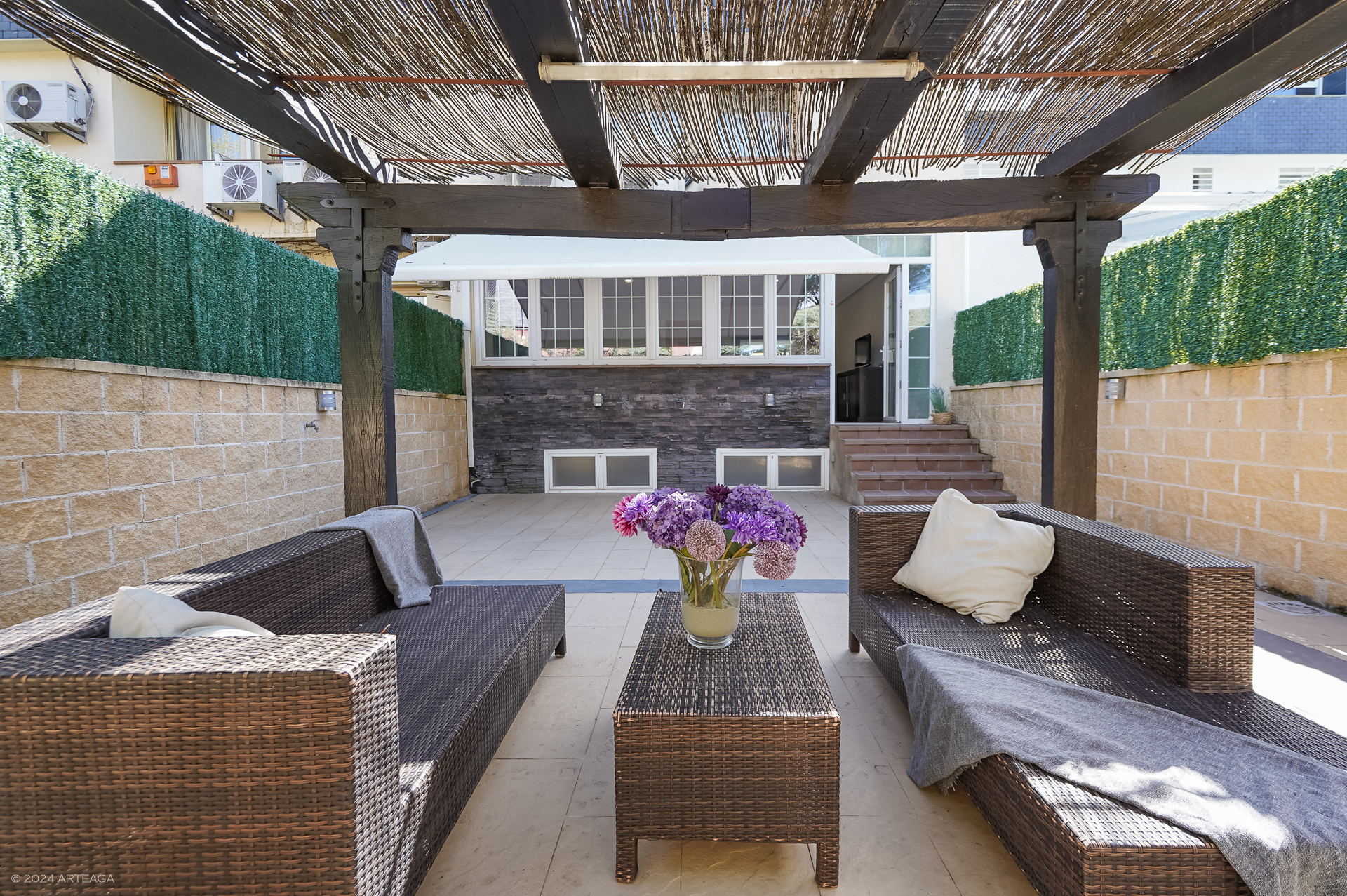 Jardín de 70 m2 , dispone de cenador, barbacoa, toldo automático e iluminación.
