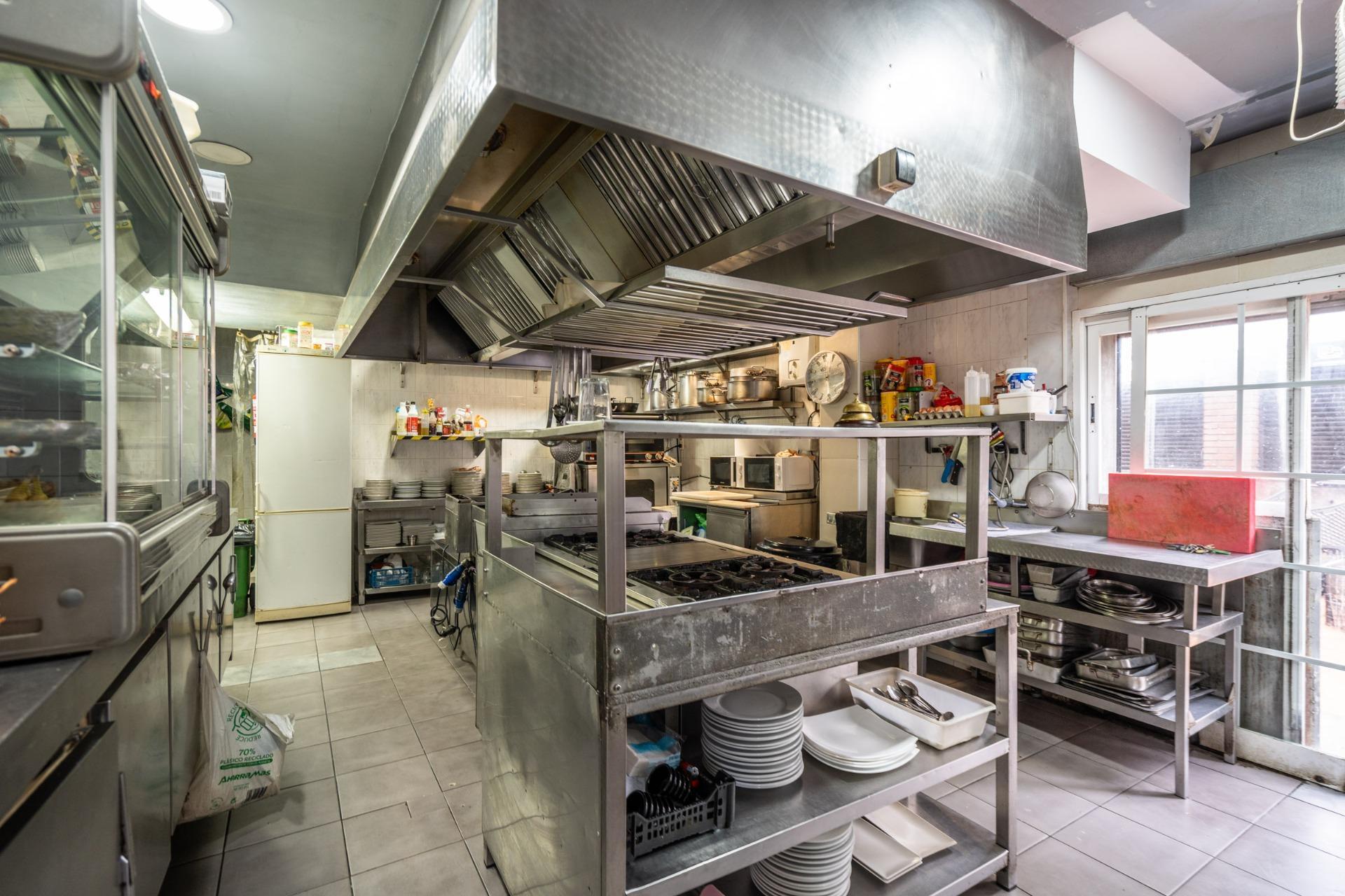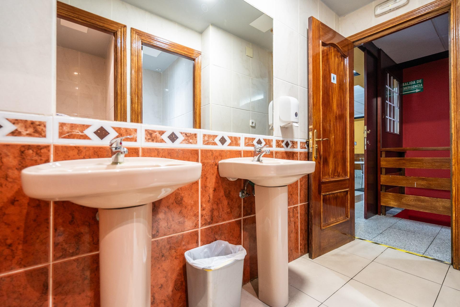 En la planta baja se encuentra una amplia barra con zona de recibidor, acceso directo a la cocina y un salón luminoso y espacioso. La cocina industrial está totalmente equipada, dividida en diferentes áreas de trabajo y con salida directa a una terraza cerrada privada, actualmente utilizada como almacén exterior.