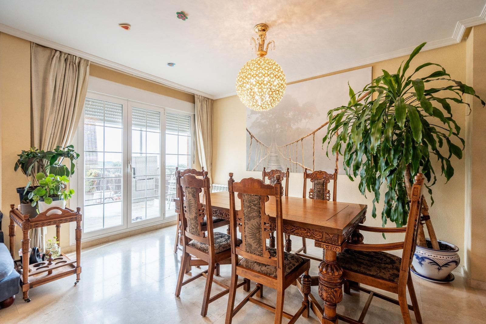 Al acceder a la vivienda, nos recibe un amplio y elegante salón-comedor, que destaca por su luminosidad y su acogedora chimenea. Desde aquí, se accede a una extensa terraza, ideal para disfrutar de momentos de relax o reuniones al aire libre.