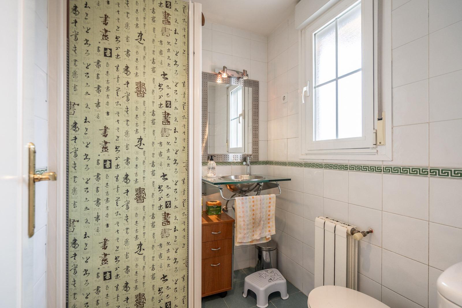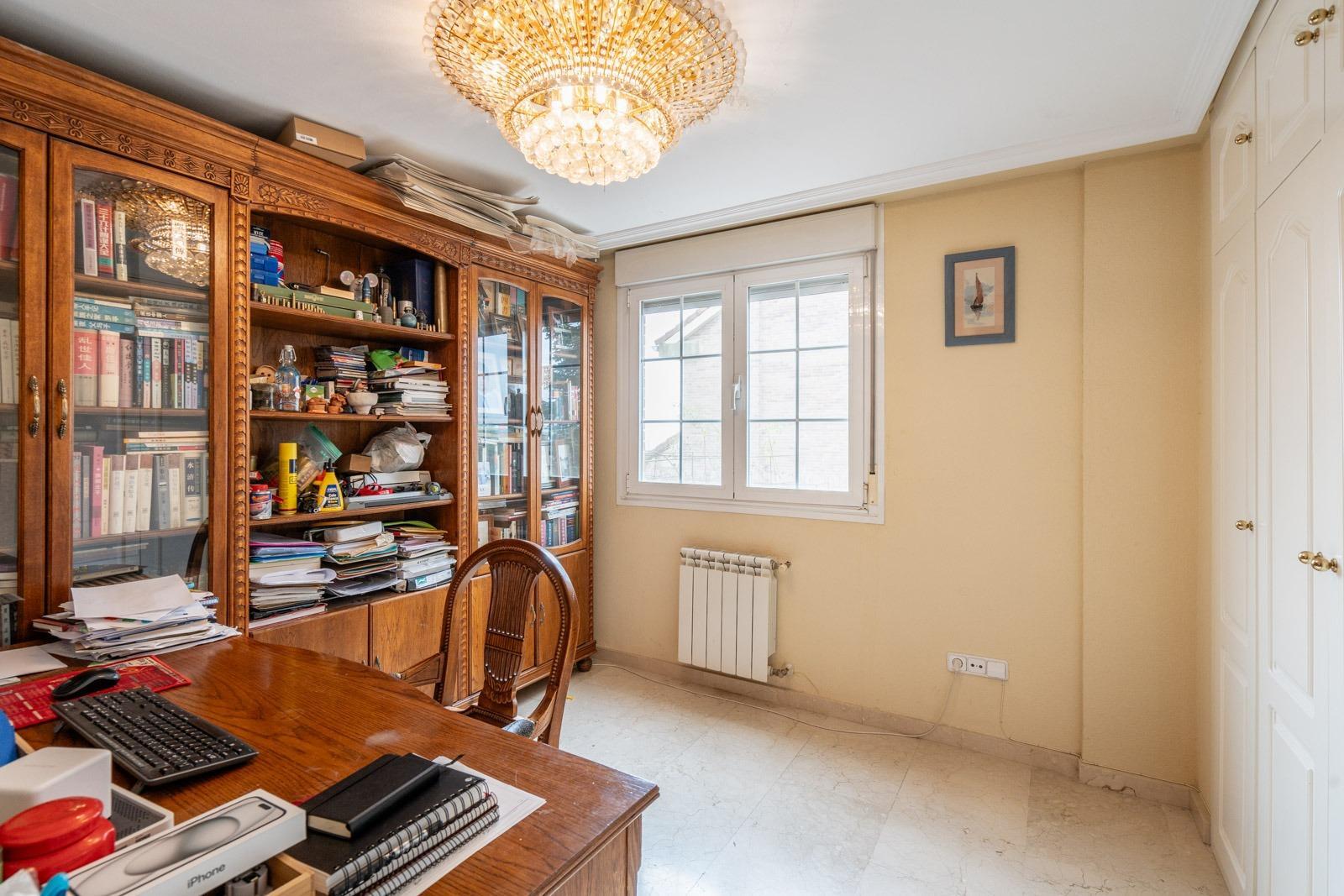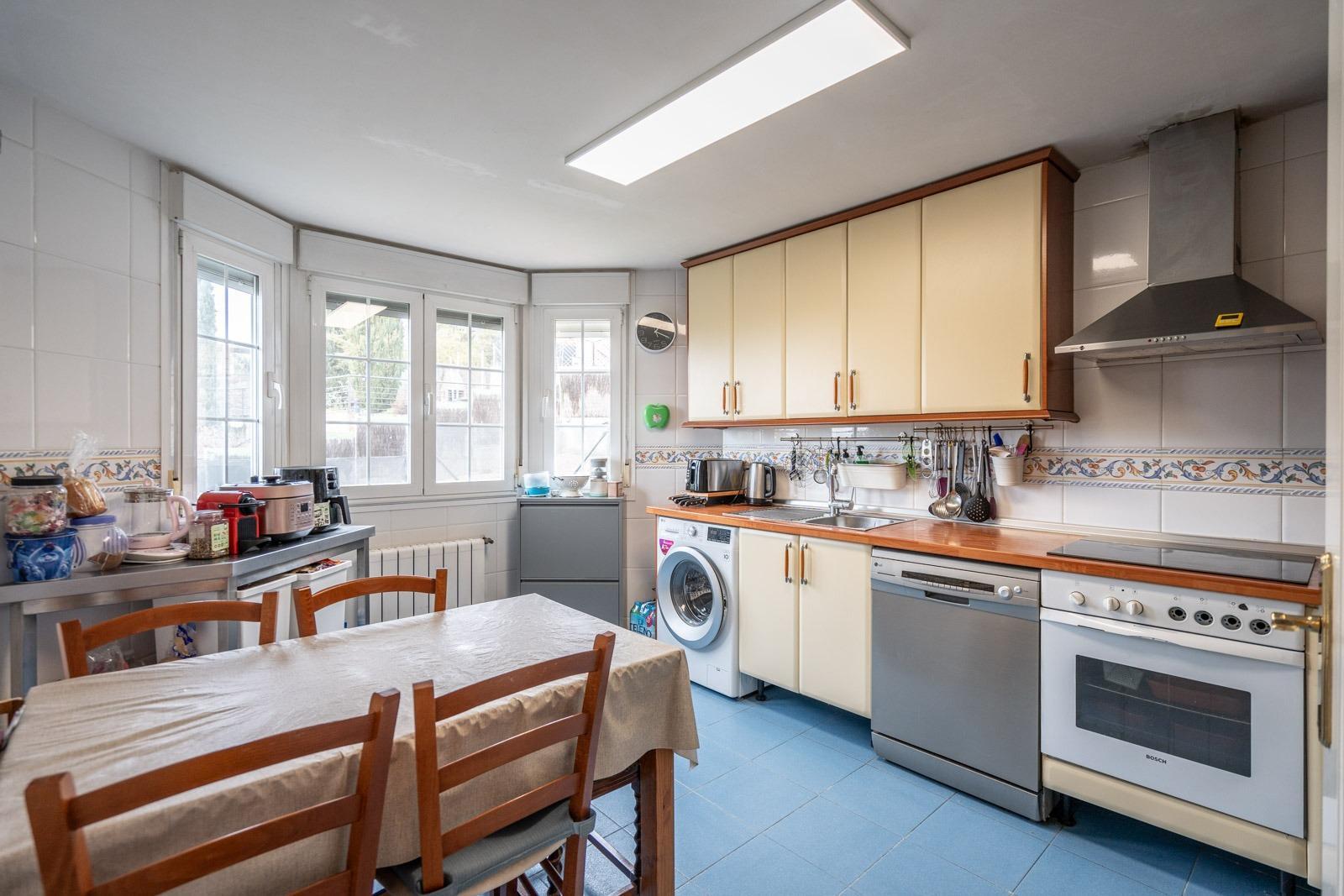 La cocina, de gran tamaño, está completamente amueblada y equipada. Además, en esta planta encontramos un dormitorio doble, actualmente habilitado como oficina, y un baño completo.
