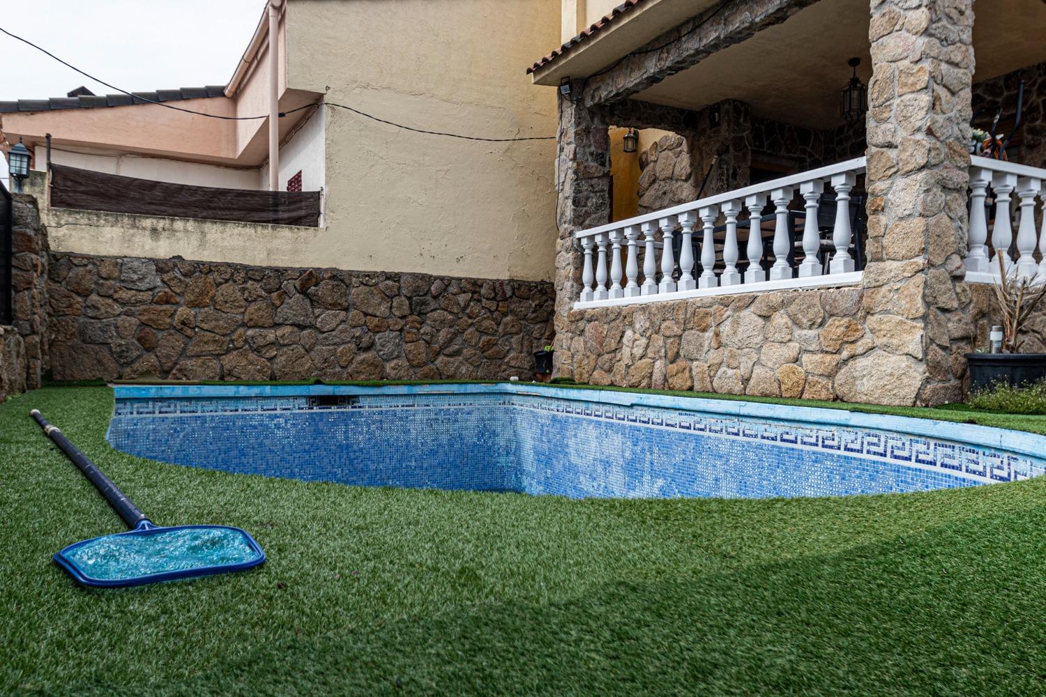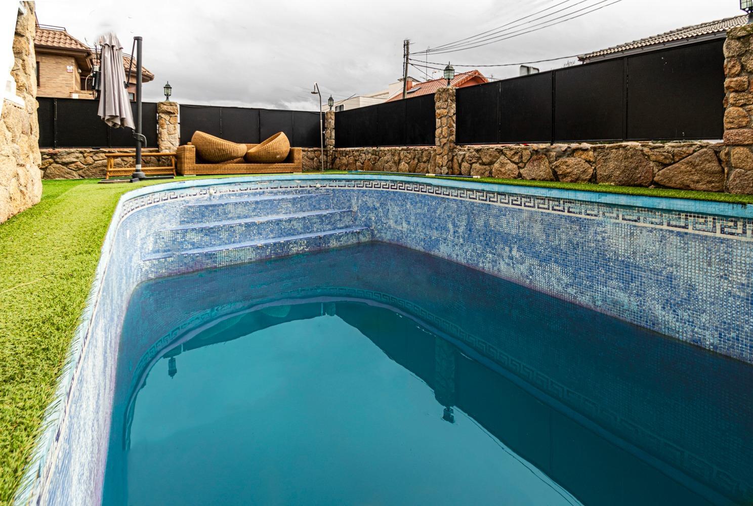 PLANTA BAJA : Amplío vestíbulo principal, armario de prendas largas y cuarto de baño de cortesía , bonito salón comedor de 30 m²con chimenea, con salida al porche exterior de 25m² sobre la piscina ,
