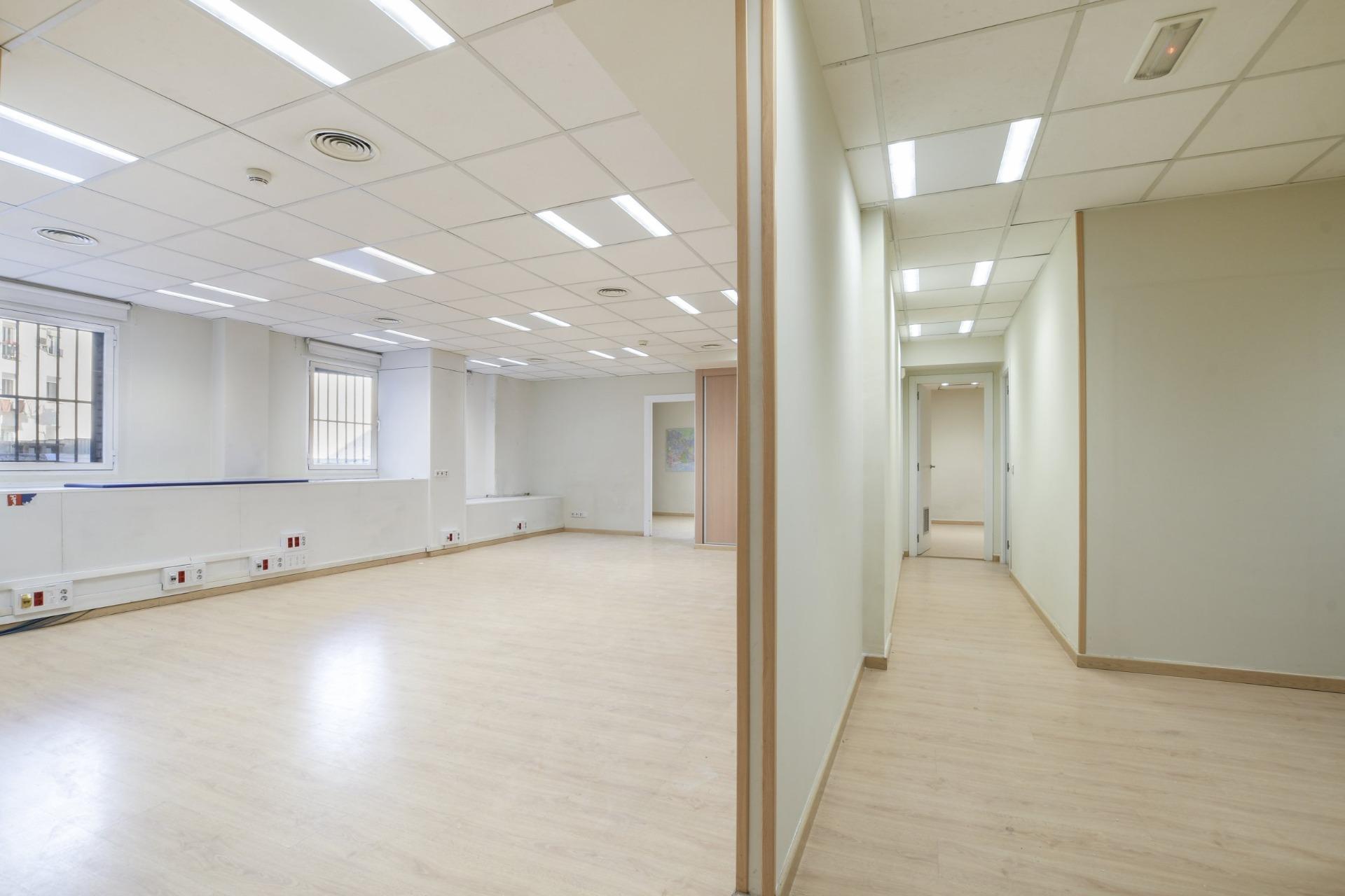 Una oficina totalmente diáfana. Con 231 m2 construidos en un espacio diáfano y con una cocina totalmente equipada y dos aseos. en edificio representativo con gran portal y varios ascensores. Portero físico.