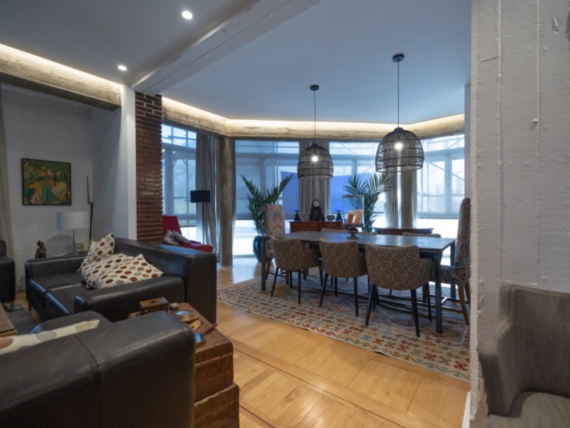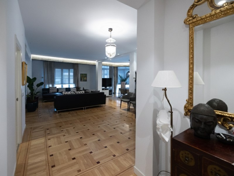 El corazón de la vivienda es un majestuoso salón de más de 110 m². Al ser una propiedad totalmente en esquina, el espacio se ve inundado por una luz espectacular gracias a sus impresionantes ventanales, que aportan una sensación de libertad y elegancia difícil de encontrar en el centro de la capital.