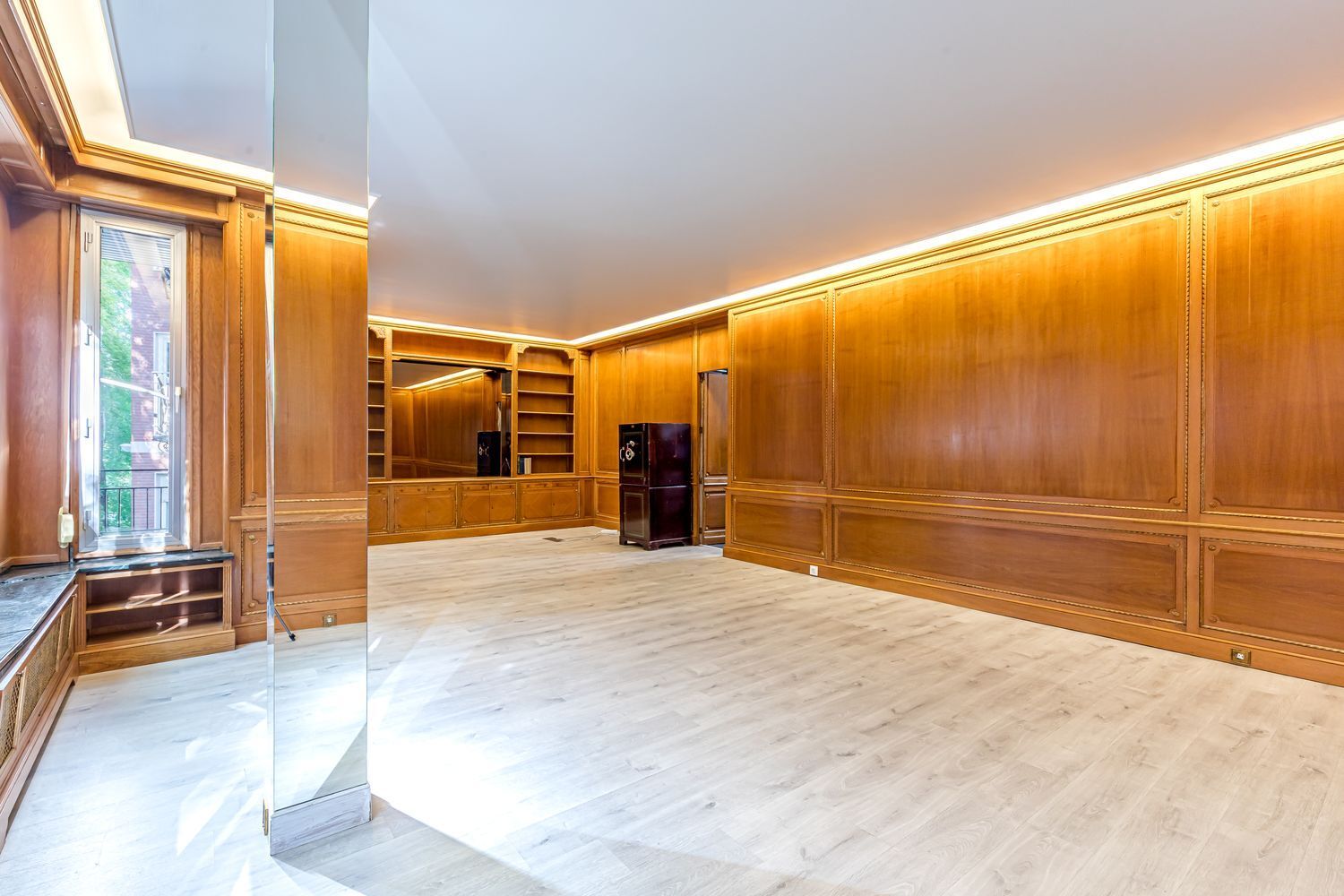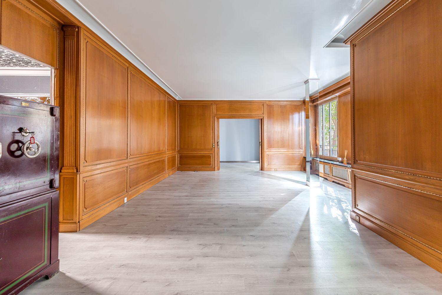 Desde nuestra puerta principal accedemos a un salón comedor de 56 m2, dividido en dos espacios, uno de ellos con salida a una terraza con vistas a los jardines y calle del Paseo del Pintor Rosales.