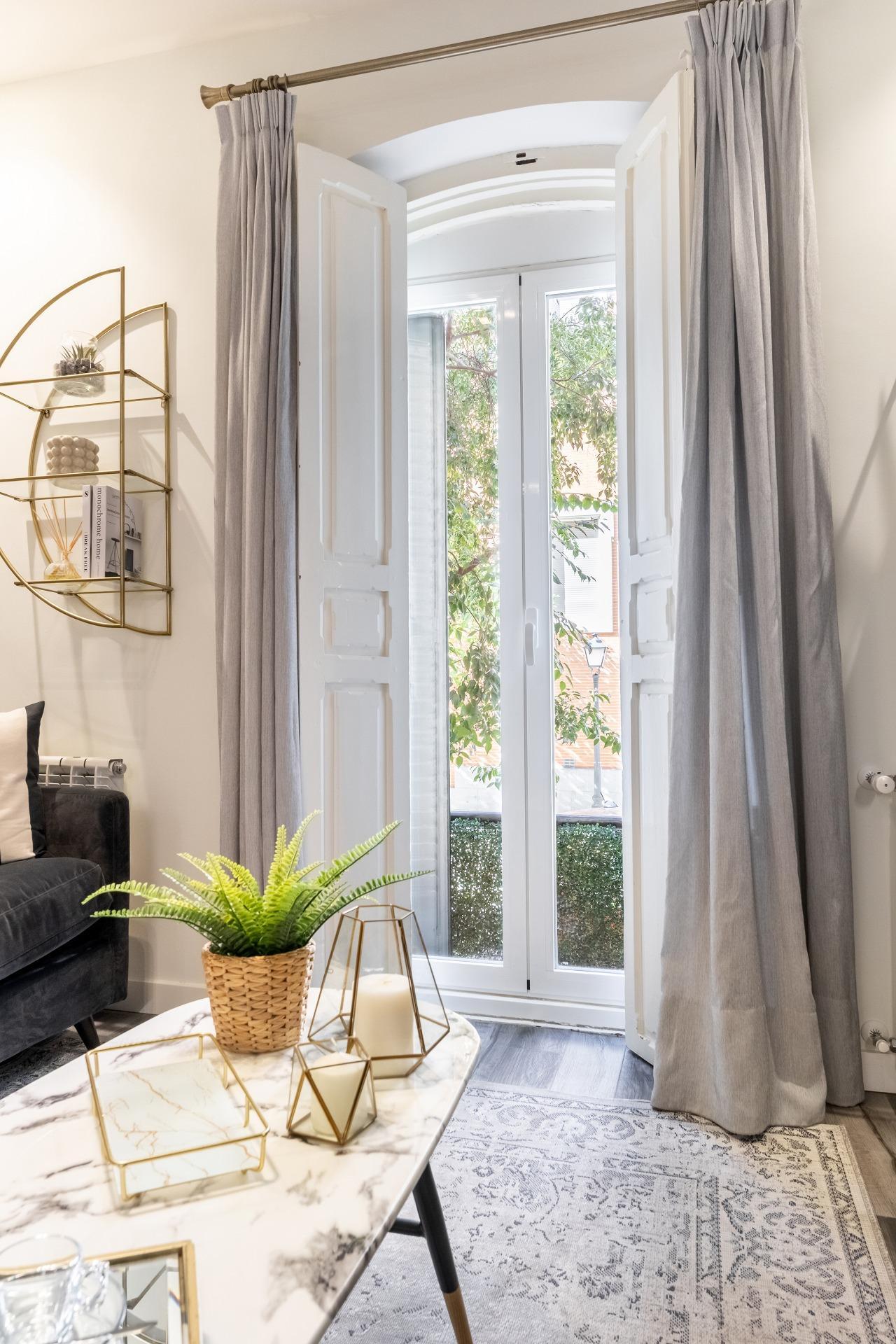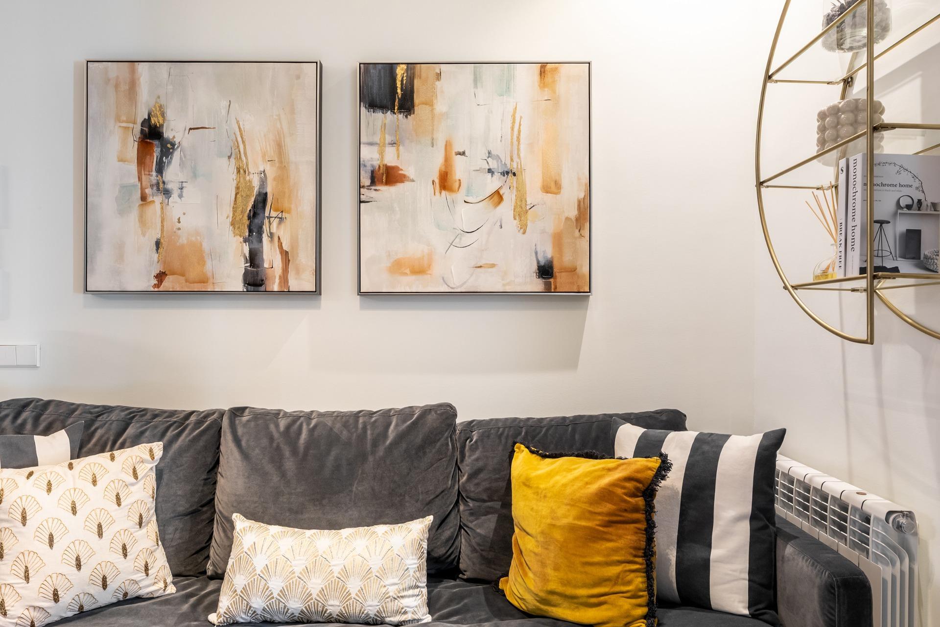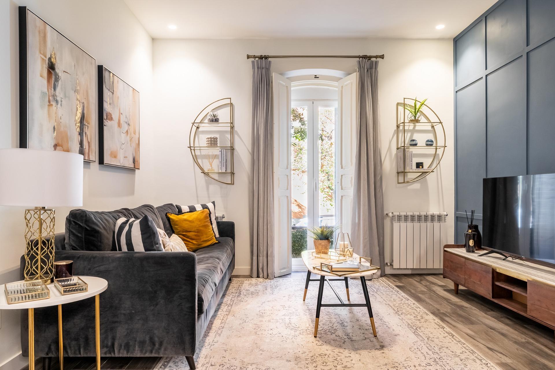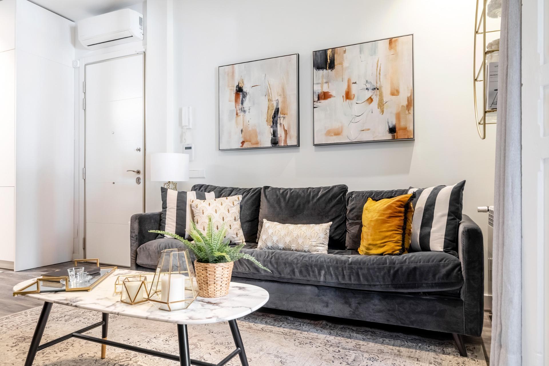 Entrando a la vivienda por la puerta principal accedemos directamente a un espacio diáfano en el que tenemos a la derecha una cocina abierta totalmente equipada y a la izquierda un salón con un balcón que abre la estancia a la calle Claudio Coello.