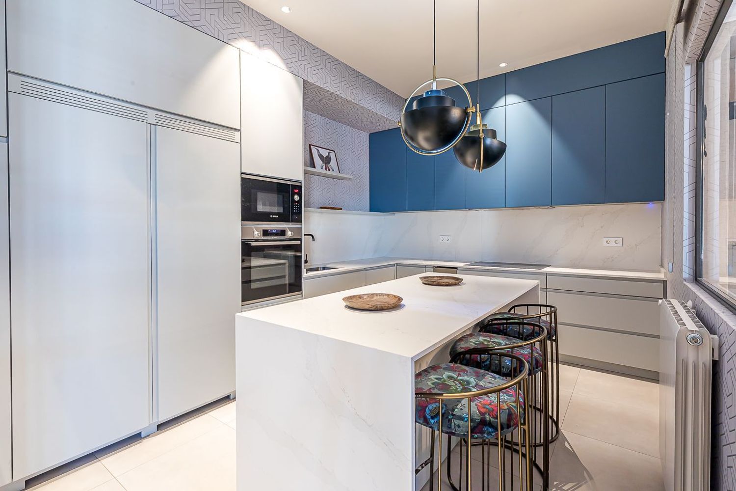 La cocina, integrada pero perfectamente delimitada mediante unas sofisticadas puertas de cristal, aúna diseño y funcionalidad, permitiendo abrirse al salón o cerrarse con total discreción, según el momento lo requiera.