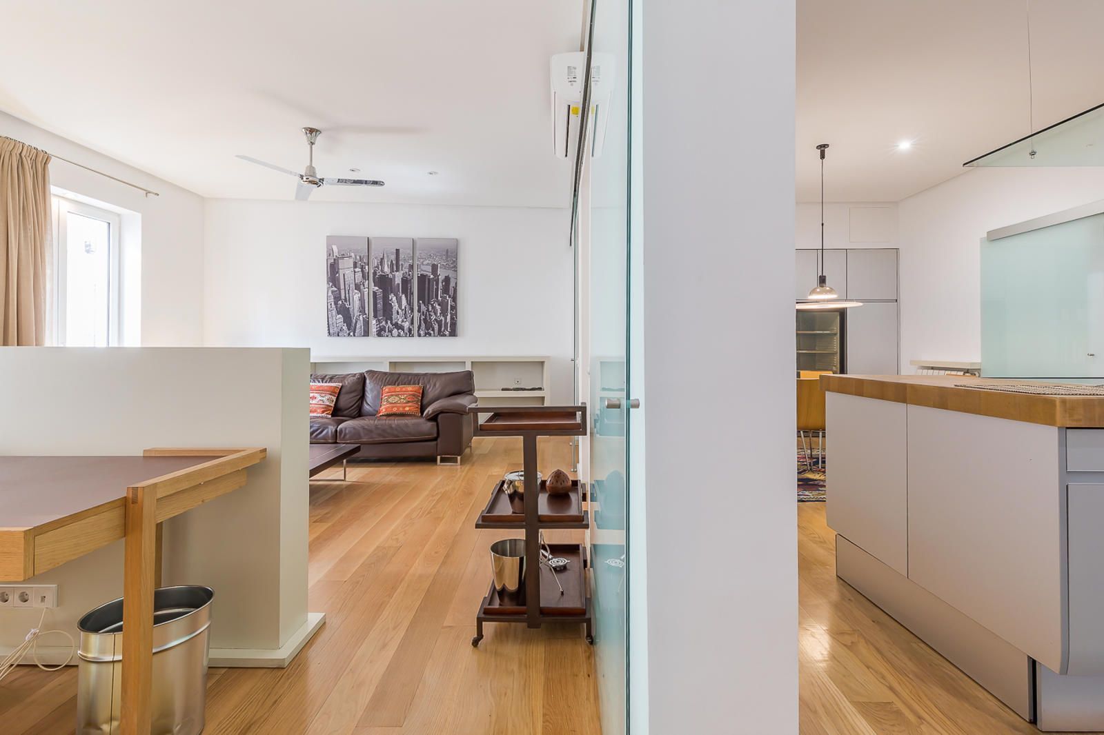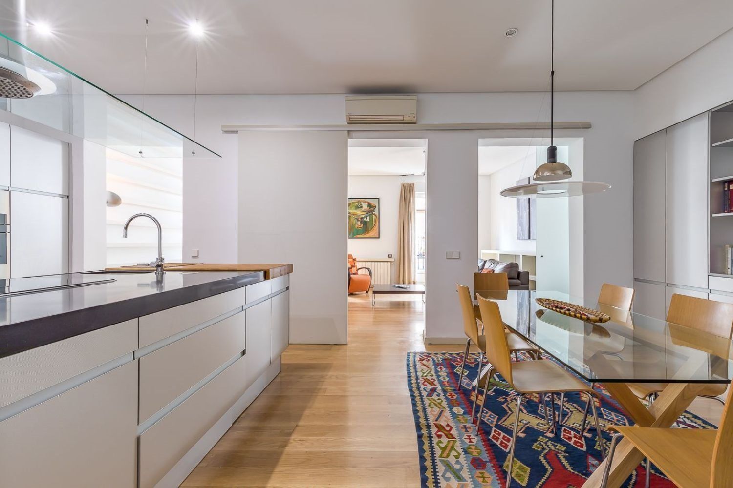 Entrando, tenemos un amplio hall con un gran armario empotrado vestido con madera que se convierte en el separador natural de las dos áreas destacadas de la casa: el área de descanso del área de estancias comunes.