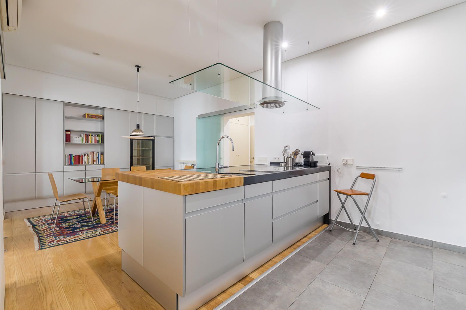 A mano izquierda del hall, encontramos un magnífico salón que por su amplitud permite albergar dos espacios: el de estar con una TV y la de despacho y lectura, donde una biblioteca de obra es el eje principal (en las fotos se aprecian dos decoraciones diferentes), 2 balcones a la calle Huertas permiten disfrutar de luz natural durante todo el día por la orientación Sur de la casa; una puerta corrediza puede separarlo o unirlo al cálido comedor, el cual, está unido a la cocina abierta y con una isla para que alguien amante de la gastronomía disfrute preparando sus platos preferidos.