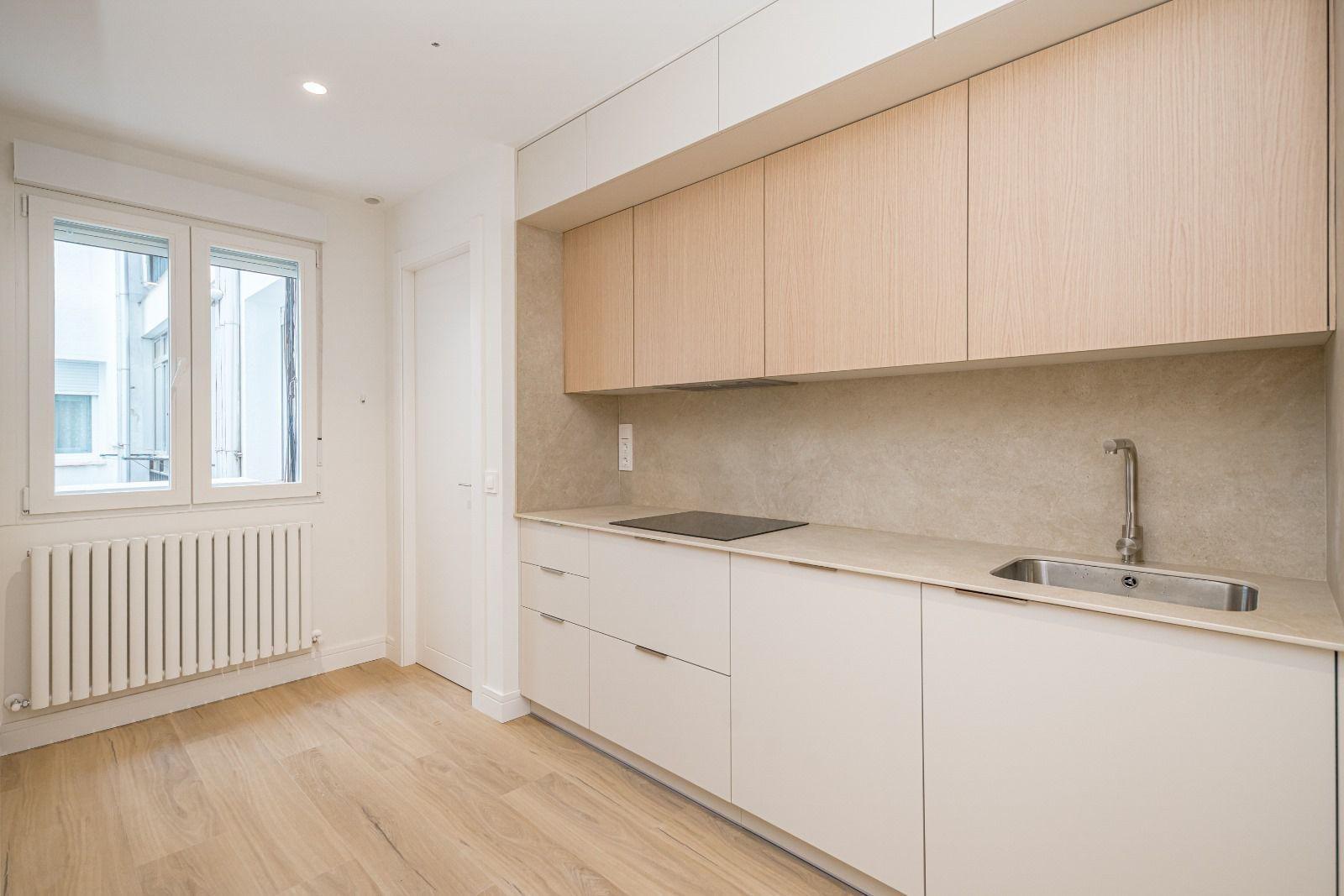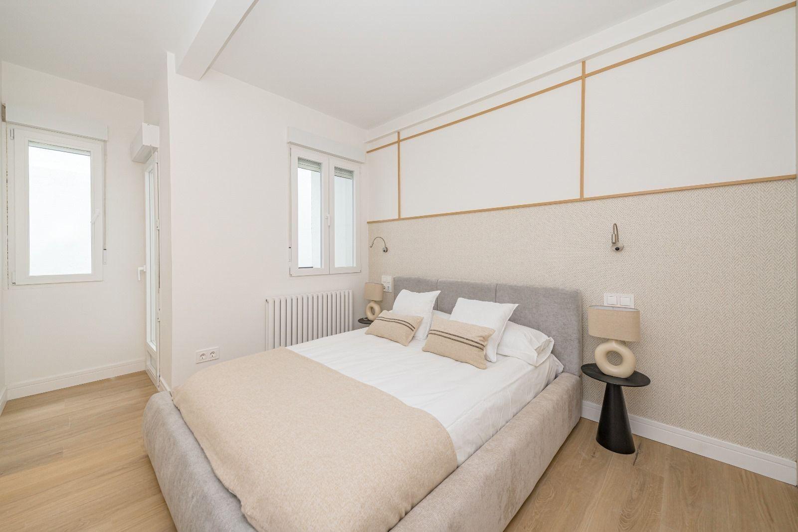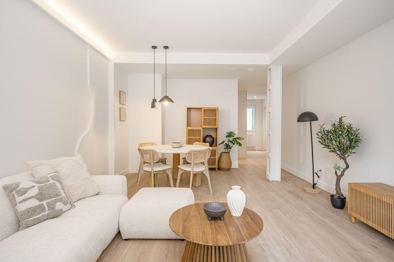 Reforma integral con criterios de eficiencia, confort y durabilidad~Instalaciones de fontanería y electricidad completamente renovadas (boletines incluidos)~Climatización por conductos con sistema AirZone, que permite regular la temperatura por estancia~Iluminación LED indirecta de bajo consumo~Techos altos con molduras restauradas~~Acabados y materiales~Suelos vinílicos texturizados de alta resistencia~Carpintería interior lacada en blanco de gran formato~Armarios empotrados hechos a medida~Cocina personalizada con materiales de primera calidad~Electrodomésticos integrados de marcas Bosch y Balay~Ventanas de PVC con cristal Guardian Sun: aislamiento térmico, acústico y control solar~~