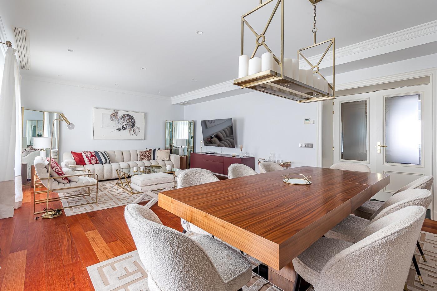 Entrando a la vivienda por la puerta principal accedemos a un gran hall que divide el piso en dos áreas, en la primera a la derecha estaría la cocina totalmente equipada y por la izquierda el salón comedor con tres balcones a la calle Don Ramón de la Cruz. Y la segunda, de frente por este mismo hall llegamos a un descansillo con unas escaleras que sube a la segunda planta, un aseo de cortesía y un dormitorio en suite con baño incorporado y vestidor.