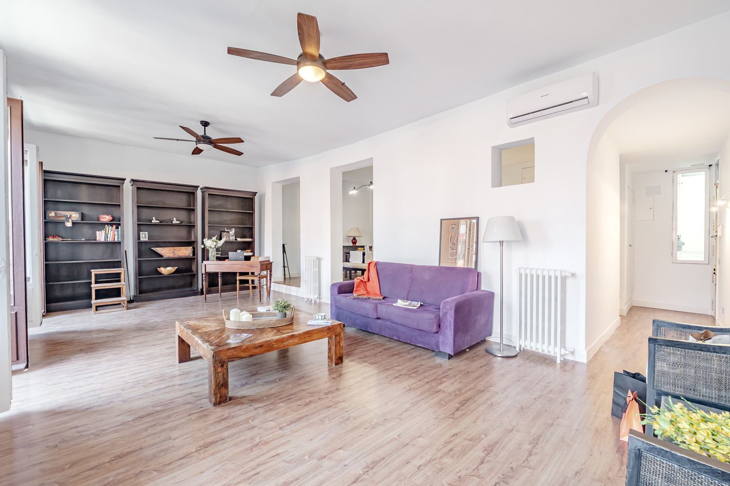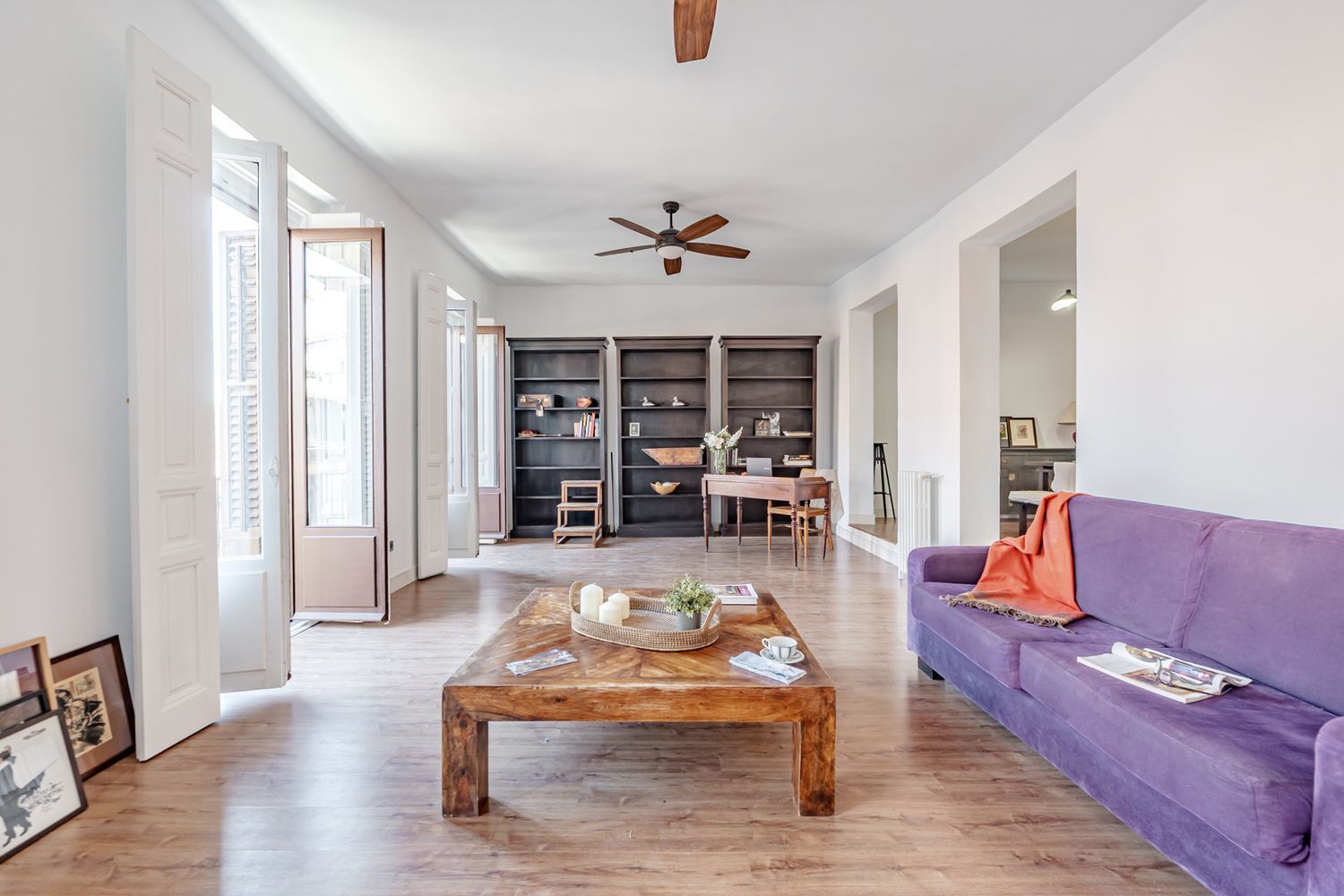 El GRAN SALÓN, de 38m², se abre a la luz gracias a sus grandes ventanales, que ofrecen agradables vistas al Arco de Cuchilleros y convierten esta estancia en un lugar amplio, acogedor y lleno de vida.