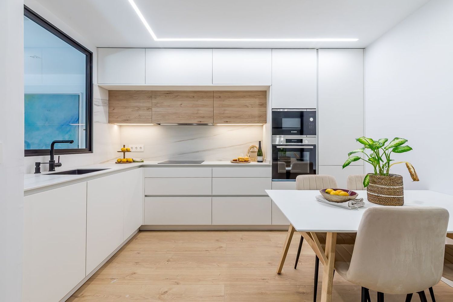 El eje central de la vivienda es su imponente salón de 55 m², abierto a la ciudad y concebido como un espacio de encuentro y sofisticación. La cocina integrada, de líneas puras y actuales, se fusiona con el comedor, creando un ambiente perfecto para recibir y disfrutar.