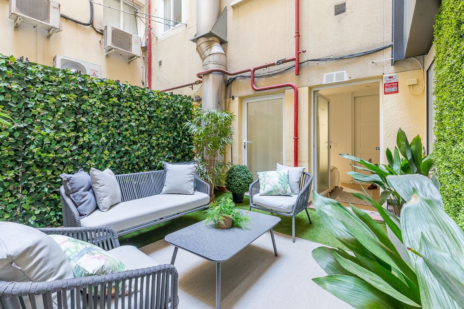 La zona de descanso alberga cuatro dormitorios que combinan discreción, amplitud y confort. Uno de ellos sorprende con un patio privativo, un rincón íntimo y bohemio, pensado como refugio personal en pleno corazón de Madrid.