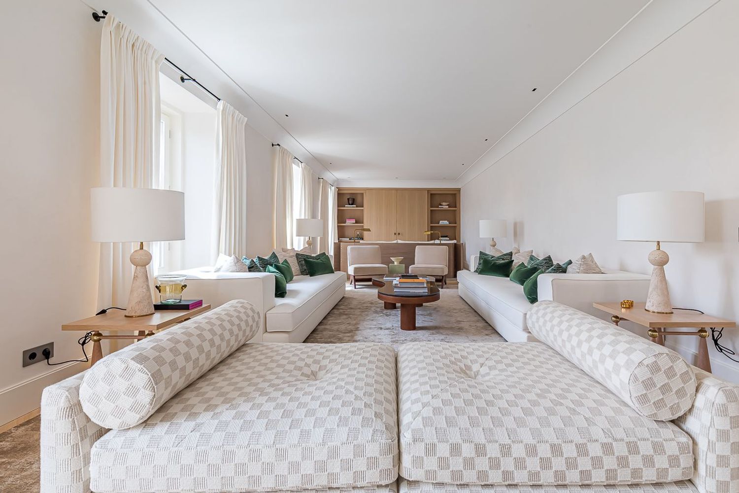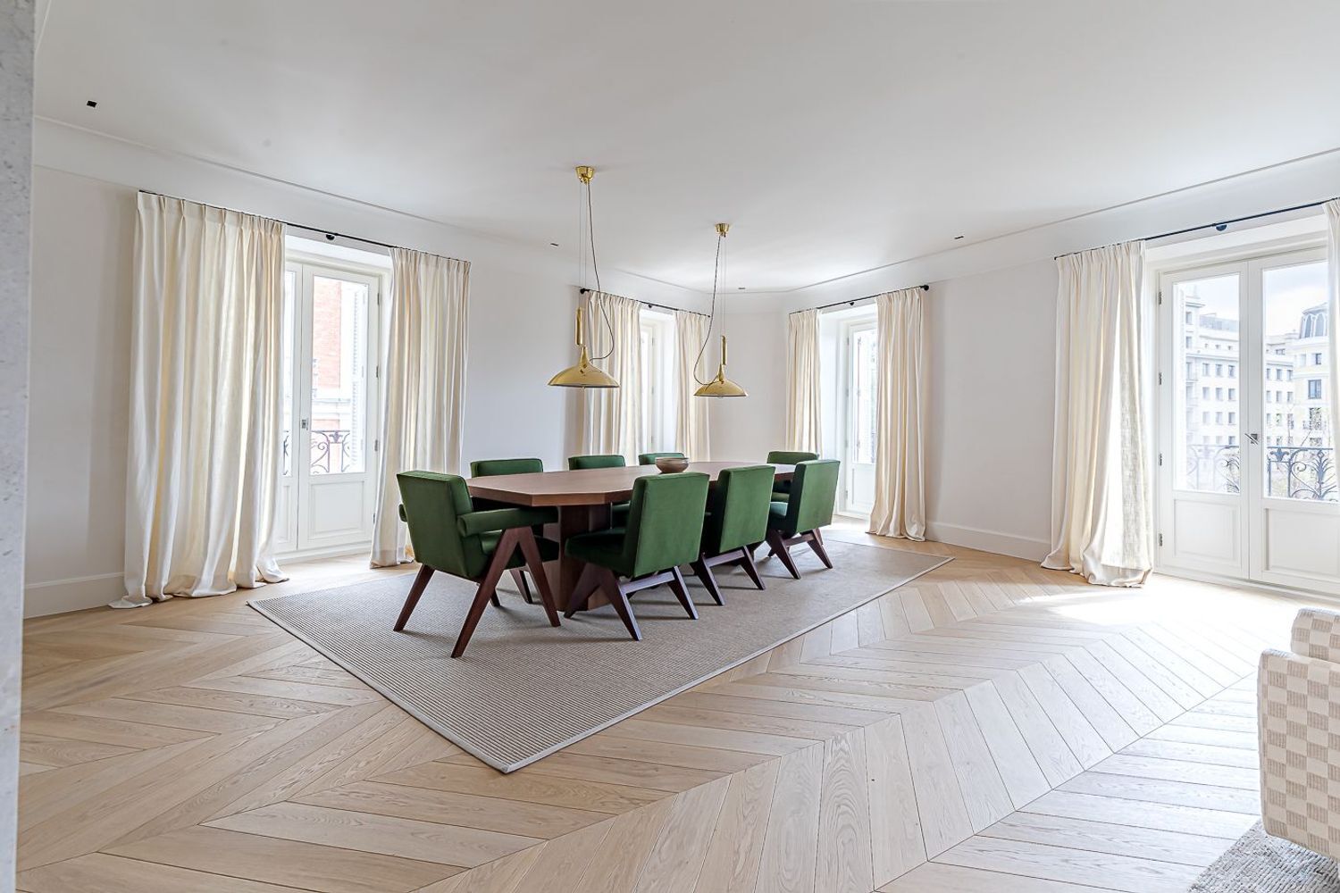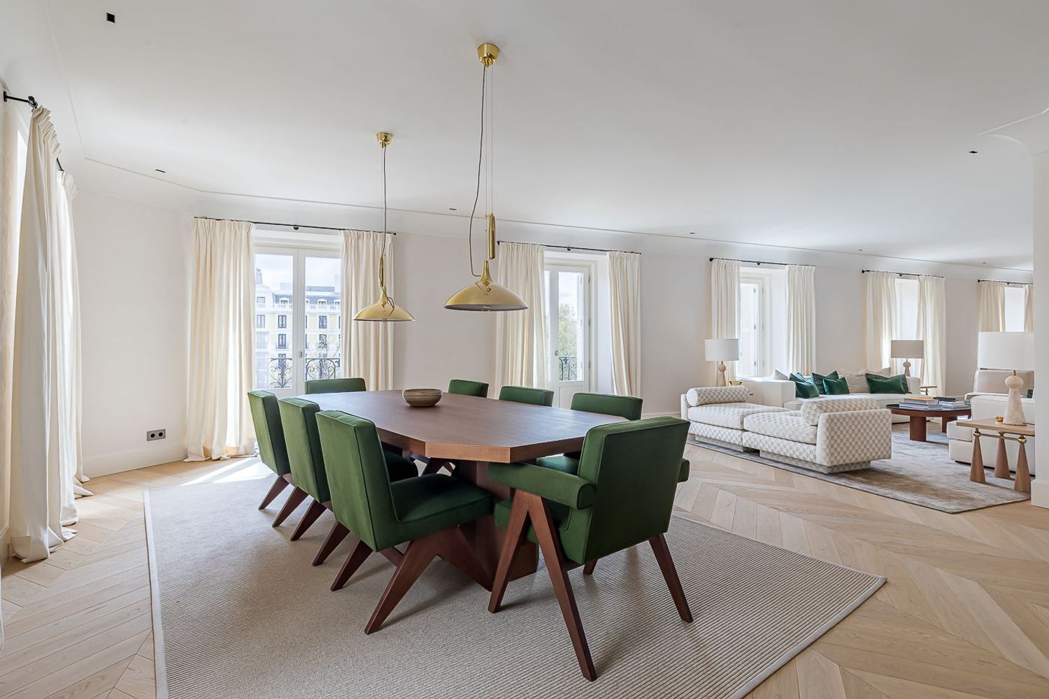 Con una imponente fachada clásica y una ubicación inmejorable, esta cuarta planta destaca por sus impresionantes doce balcones, —cinco al Paseo de Recoletos y siete a la calle Almirante— la luz natural envuelve cada estancia, potenciando una atmósfera cálida y serena. La iluminación artificial, diseñada al detalle y con mimo, resalta la nobleza de los materiales: suelos de madera maciza, carpintería artesanal, piedra natural… todo en armonía con una elegancia atemporal.