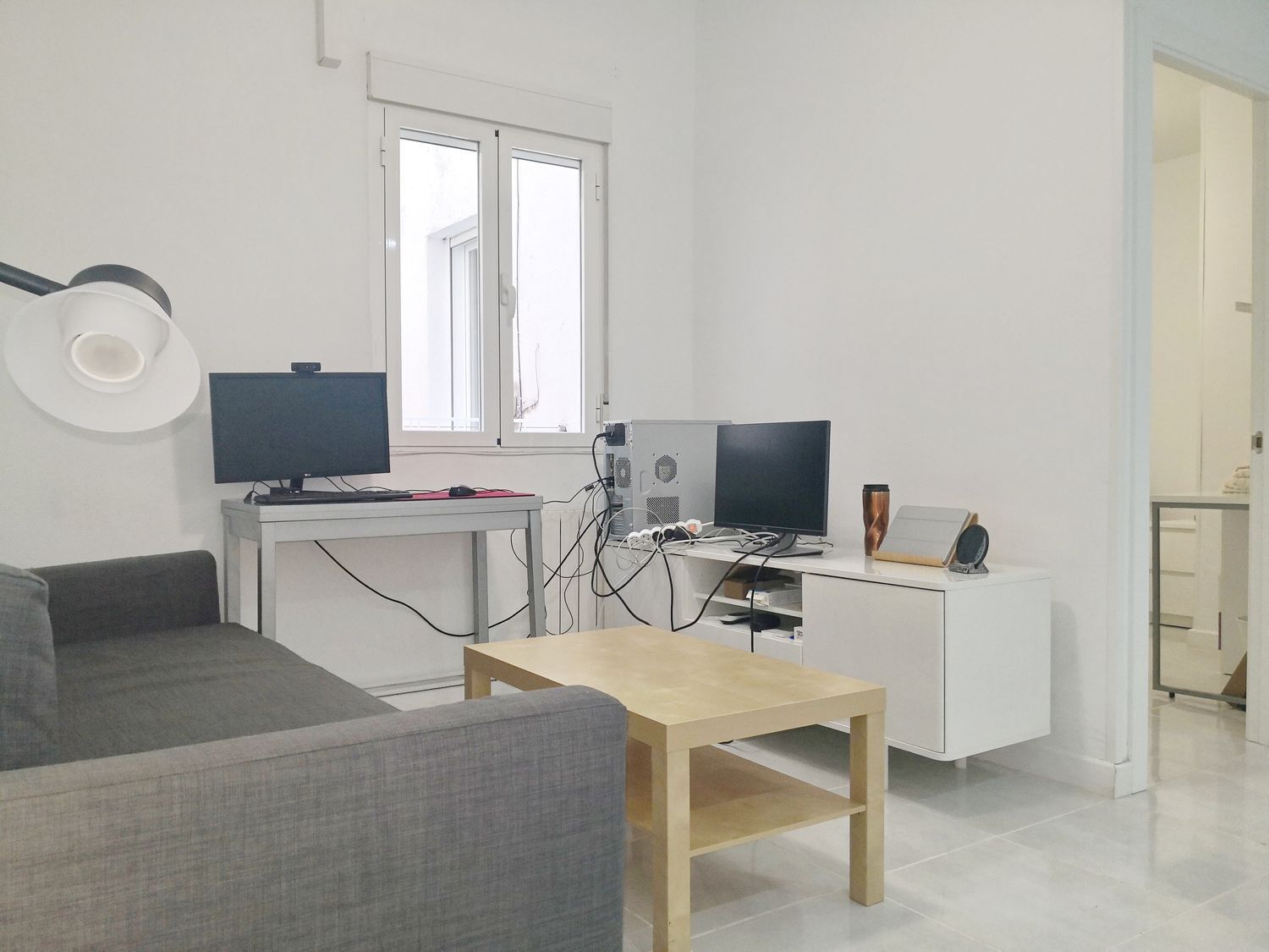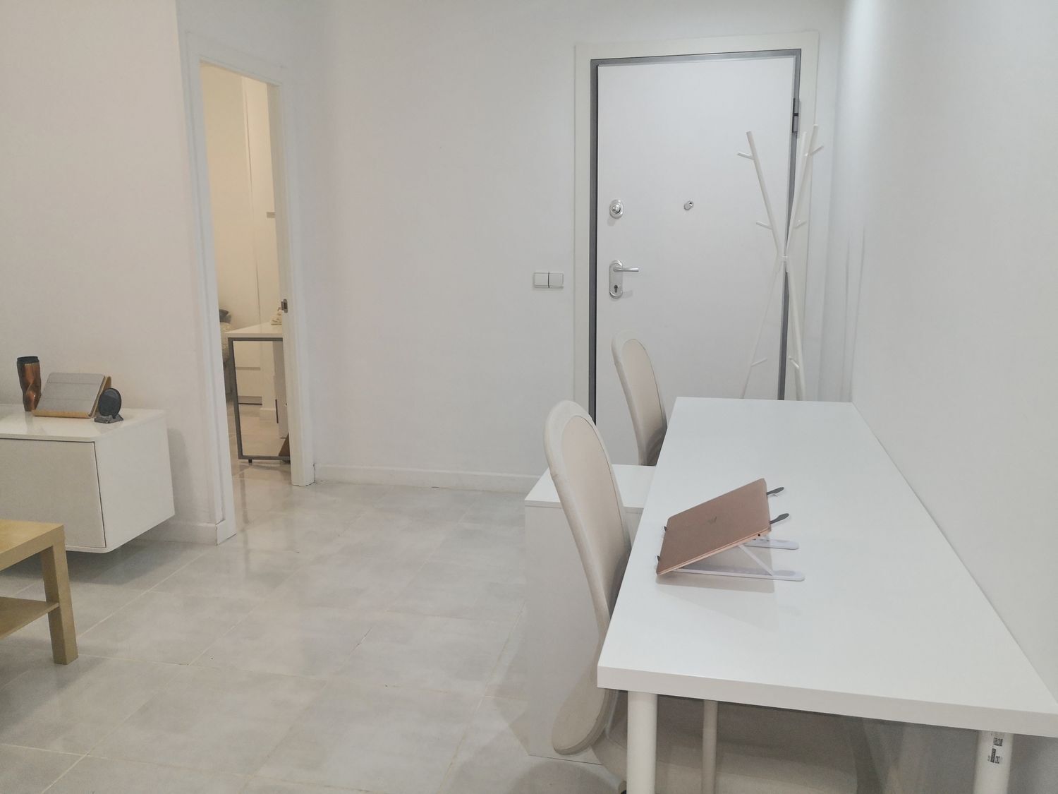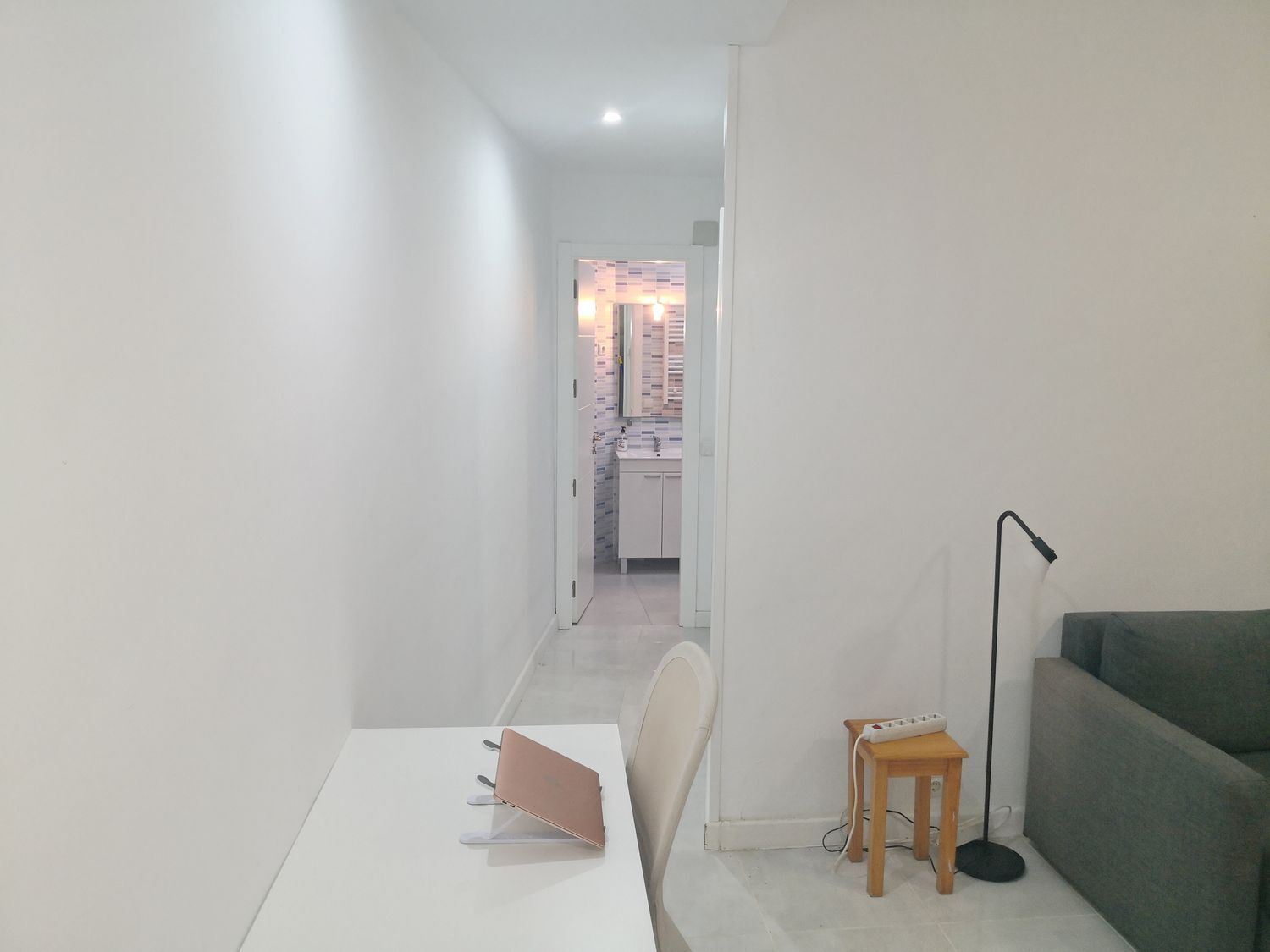 Suelos porcelánicos, carpintería interior en madera lacada en blanco.