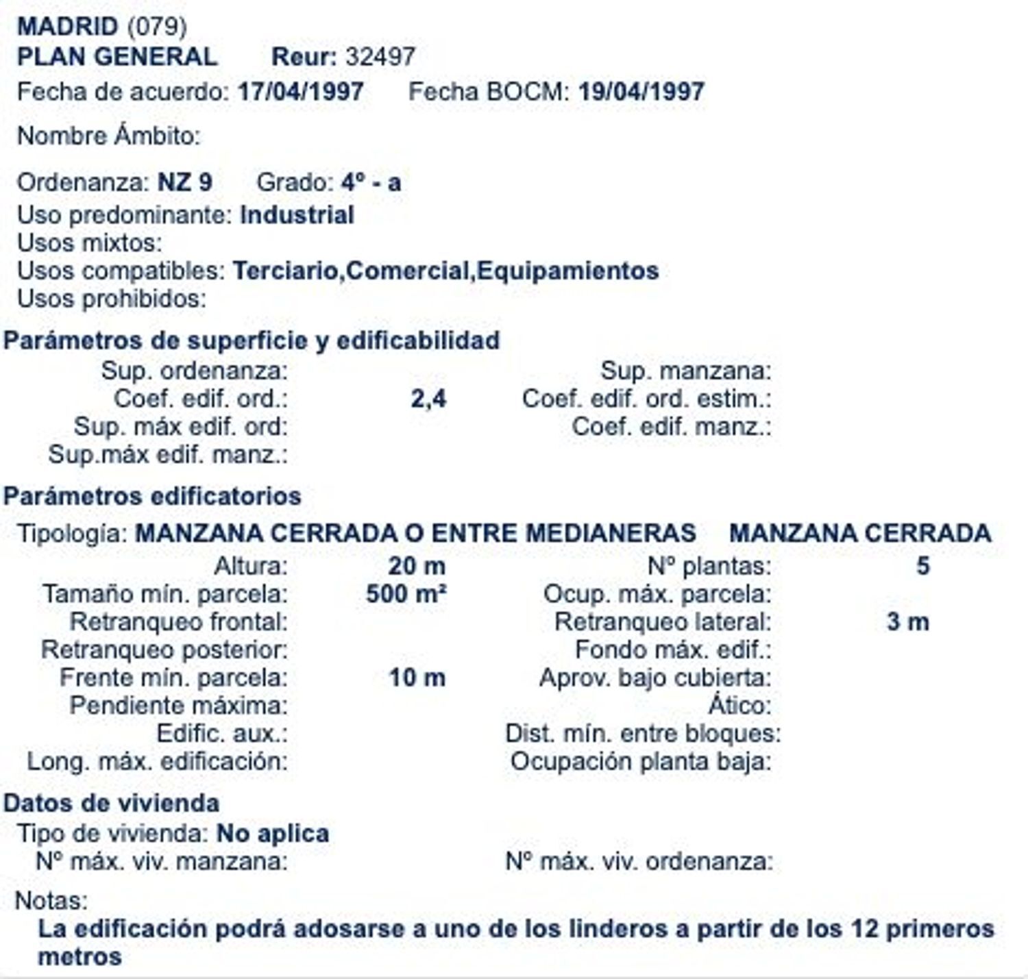 Se trata de una parcela cuyo uso principal es industrial, pero con usos compatibles de terciario, comercial y equipamientos, en base a la ordenanza NZ 9 con grado 4º-A.
