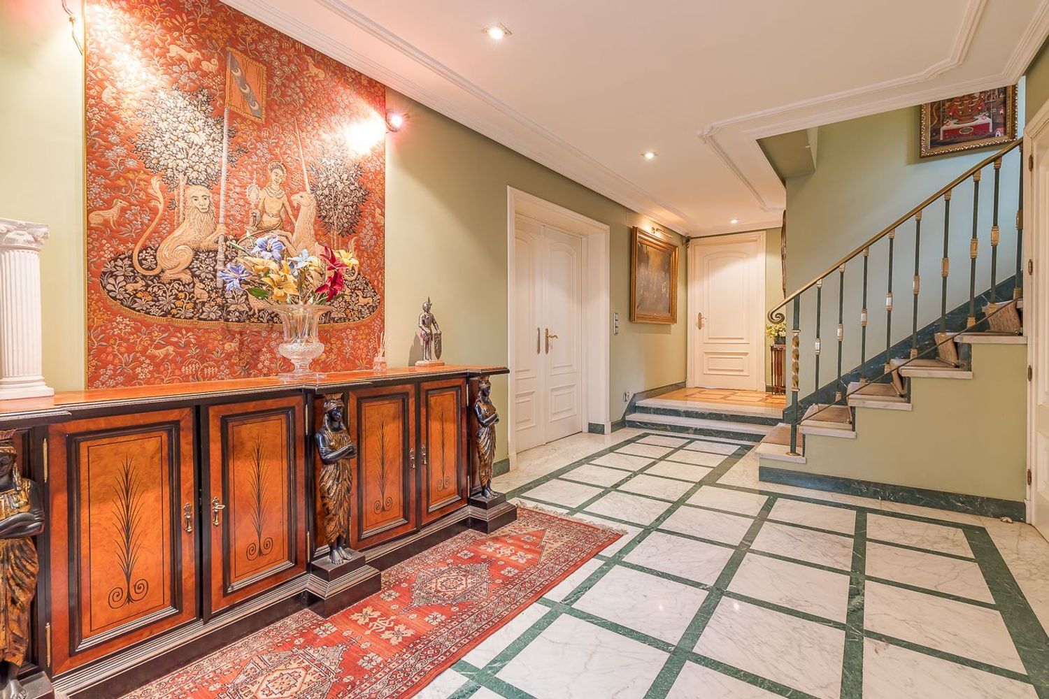Accedemos a la vivienda a través de un amplio recibidor con armario gabanero y aseo de invitados. Gran salón comedor, muy señorial, en dos alturas, para diferenciar espacios, con preciosa chimenea, amplios ventanales y por el que se accede a la gran terraza que da acceso a la zona de jardín, con preciosos árboles y una estupenda piscina de grandes dimensiones (75 m2 y más de 12 m de largo). Fantástica cocina, con acceso tanto desde el comedor como a través del recibidor. Desde la misma, podemos pasar directamente a la zona de jardín.