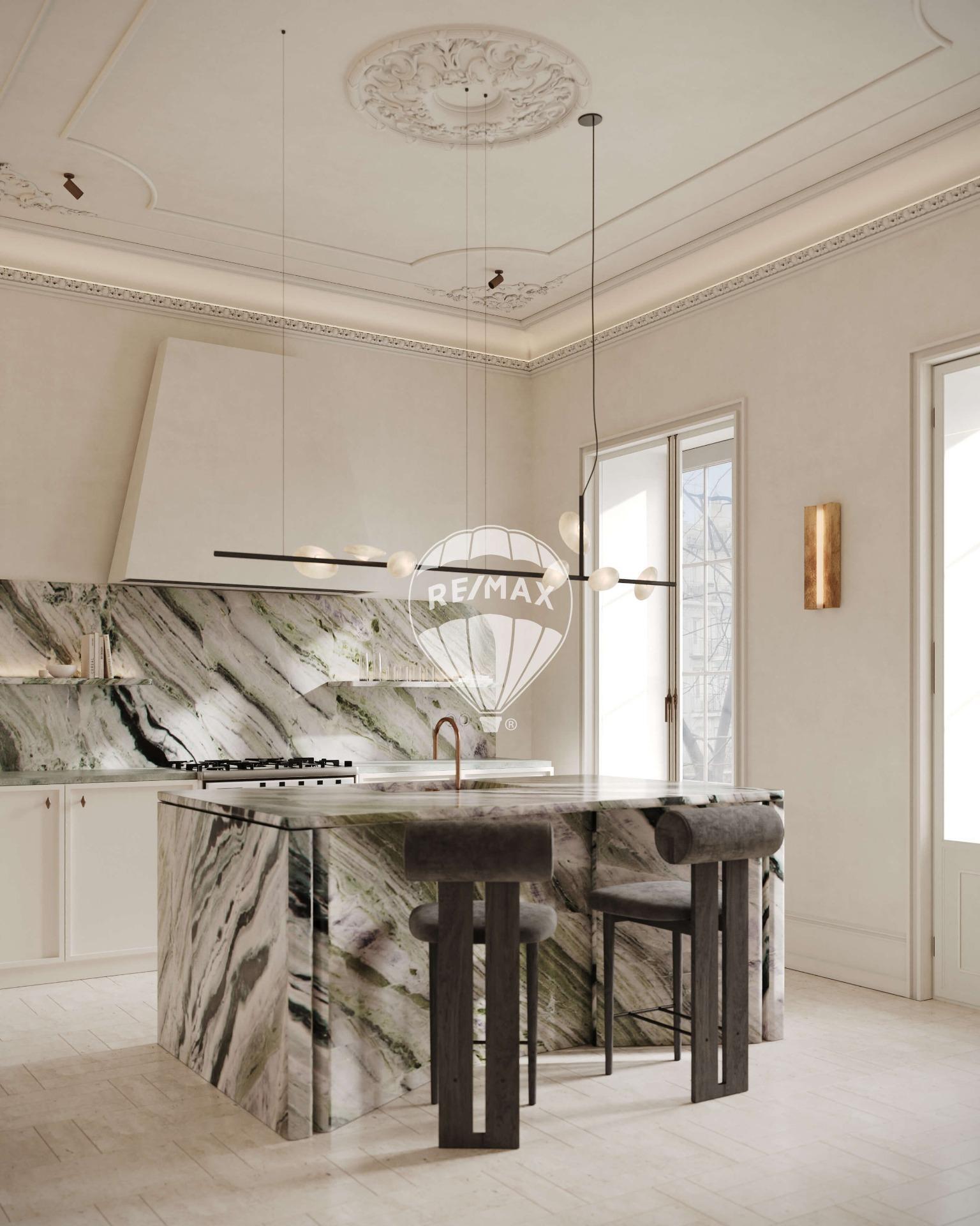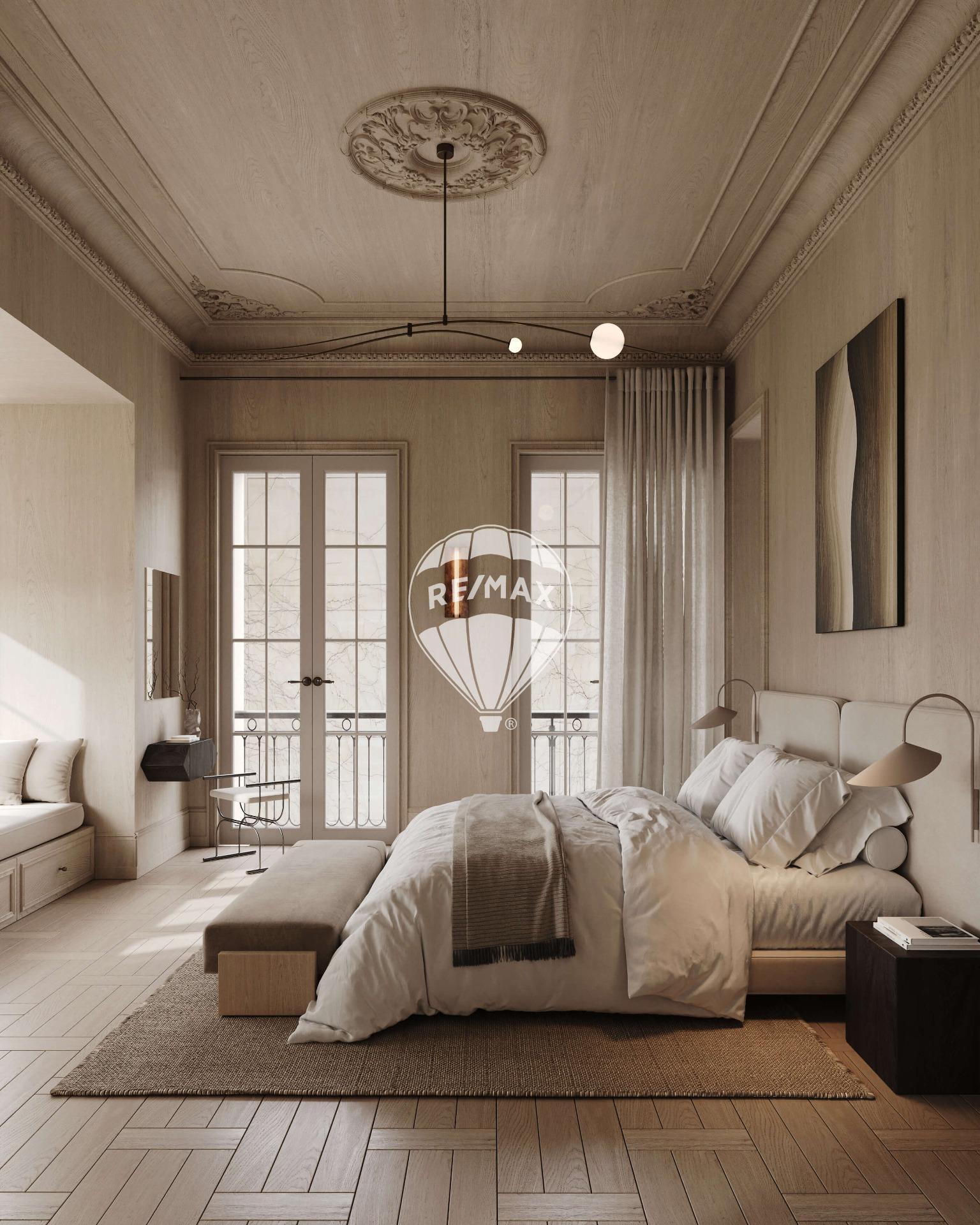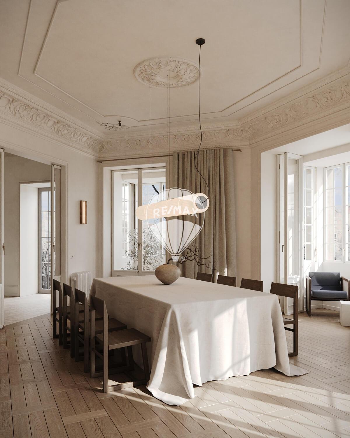 La esencia de esta propiedad reside en la combinación de elementos preexistentes, como las cornisas y las puertas clásicas, con materiales contemporáneos para crear un espacio único y lleno de carácter.
