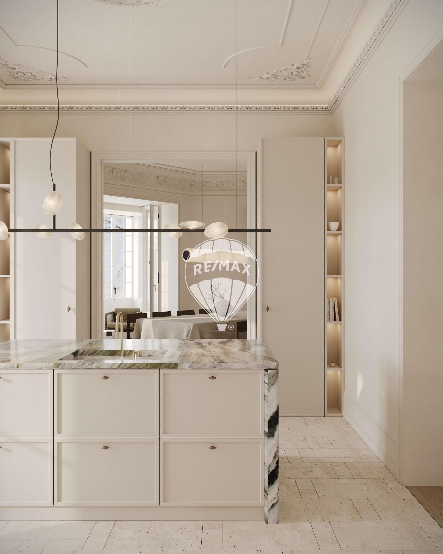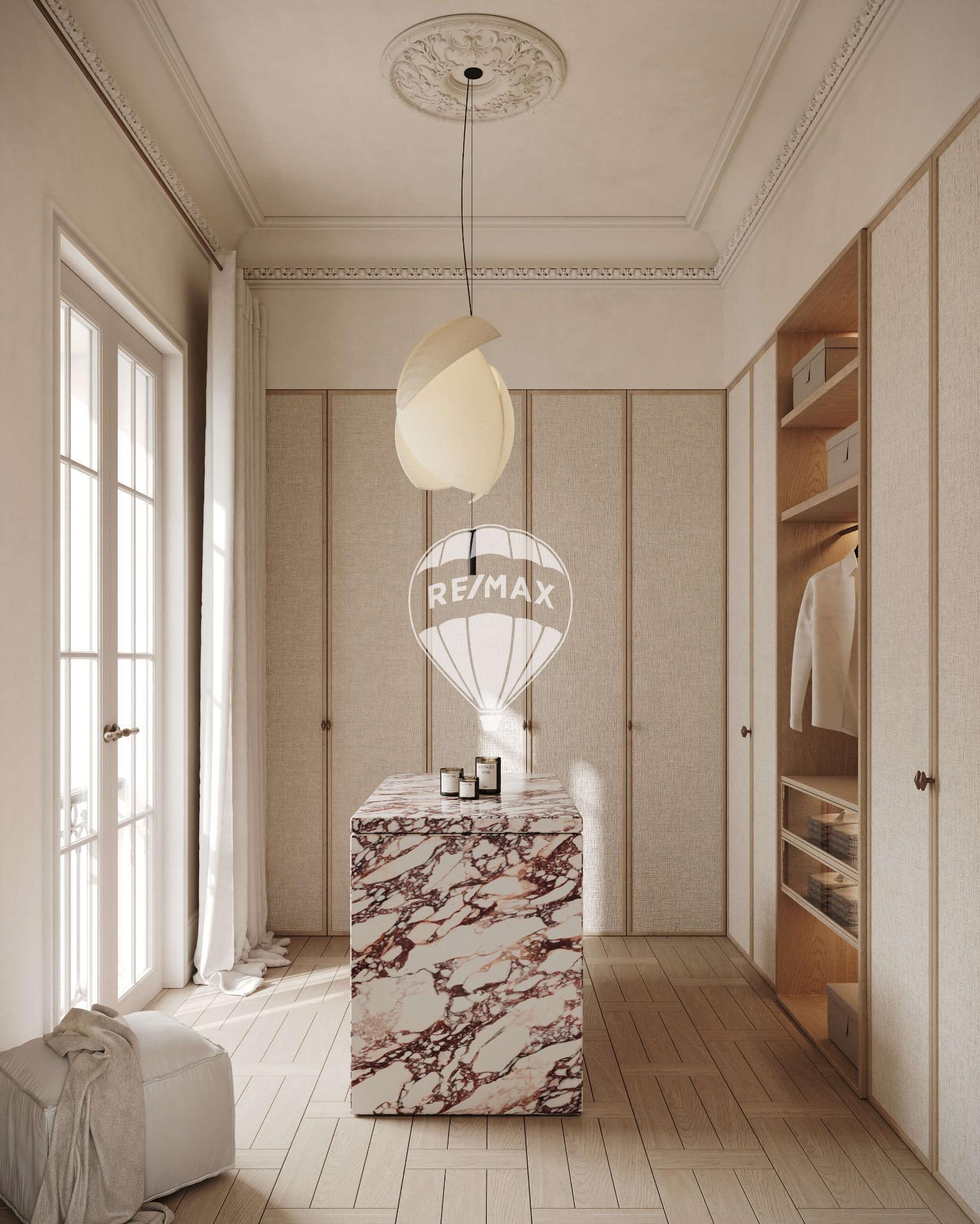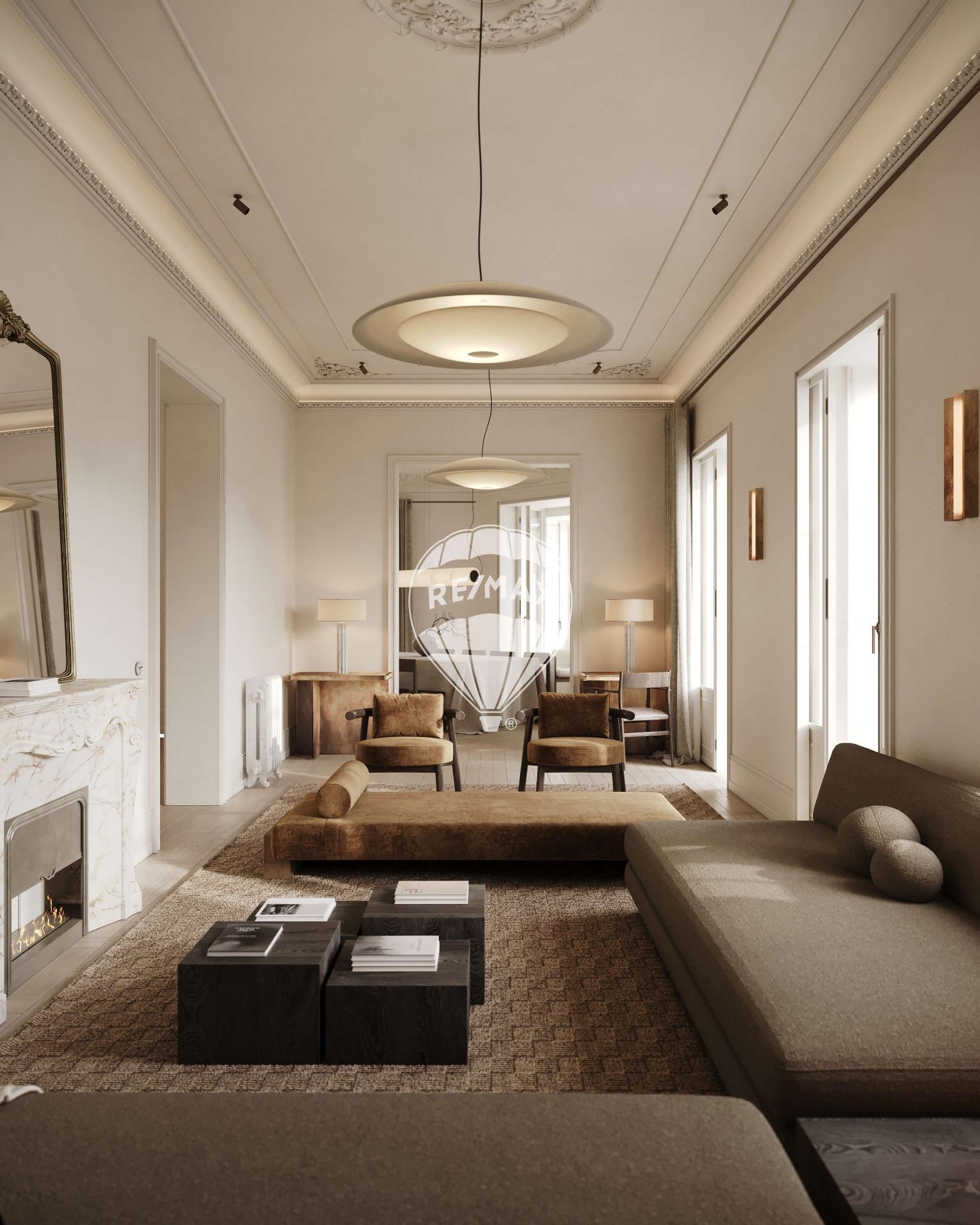 La esencia de esta propiedad reside en la combinación de elementos preexistentes, como las cornisas y las puertas clásicas, con materiales contemporáneos para crear un espacio único y lleno de carácter.