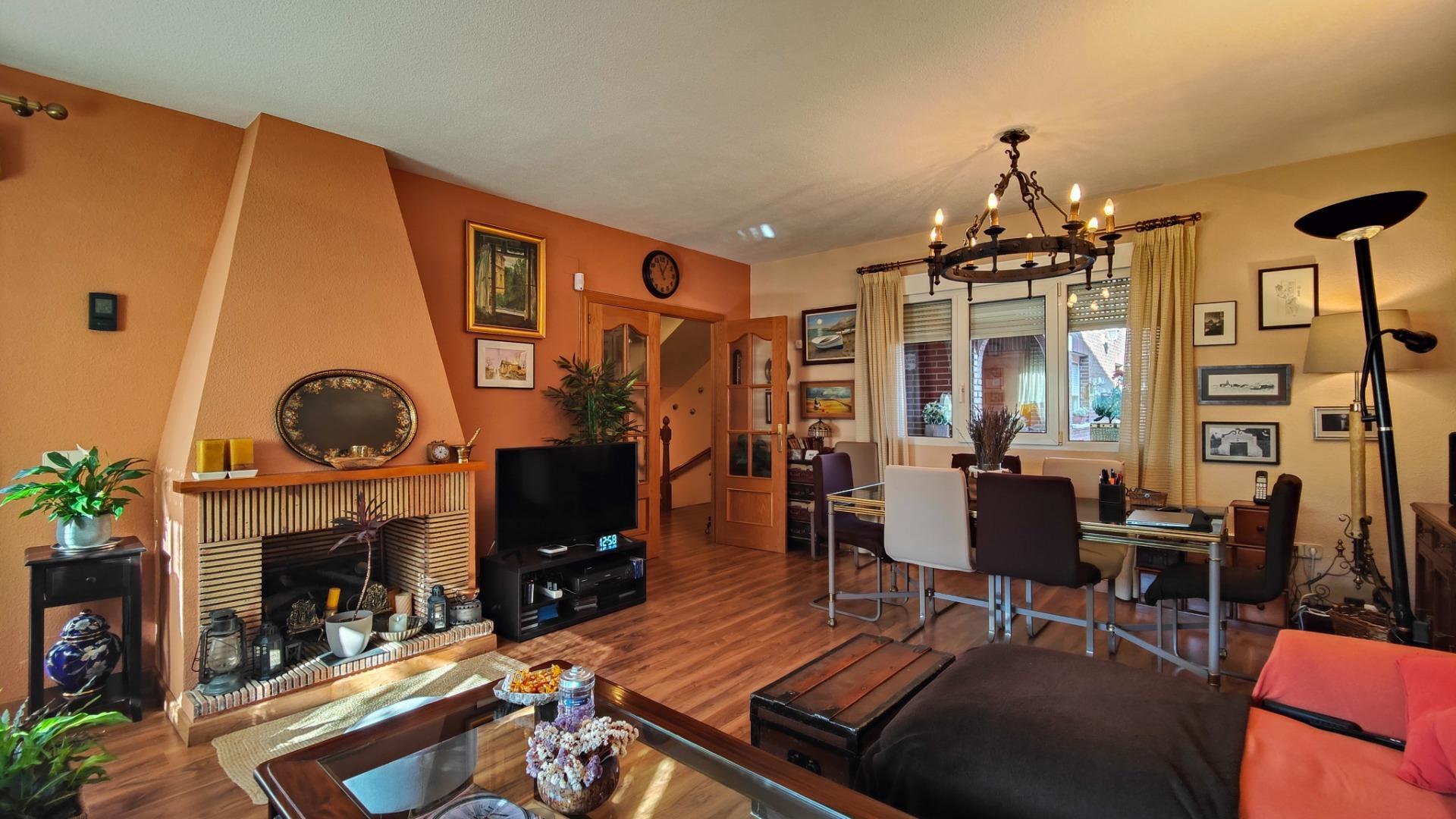 En la planta baja, entramos a la vivienda por un bonito porche en forma de arco llegando al hall de entrada que distribuye todas las estancias, empezando por el salón de 25 m2 con chimenea y salida a la terraza y bajada al jardín, la cocina de 15m2 con zona de cocina y de comedor diario, y por último un práctico aseo de cortesía y un armario empotrado.