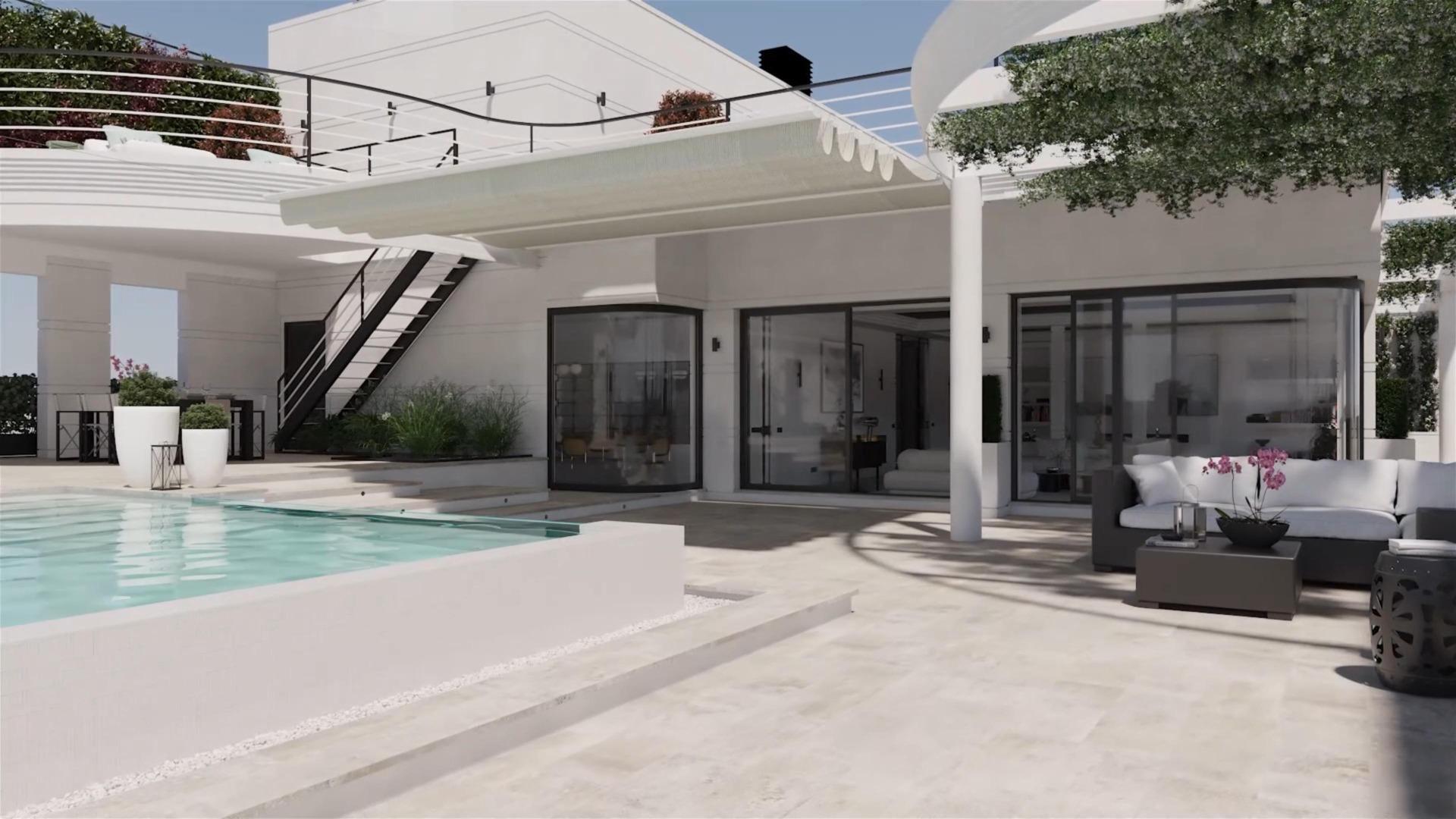 El ático cuenta con 600 m² construidos en dos plantas conectadas por escaleras interiores y exteriores: una planta principal de 400 m² y una planta superior de 150 m². Su exterior suma 750 m² de terrazas privadas, con vistas panorámicas que abrazan el skyline madrileño. La terraza principal está equipada con iluminación led perimetral, riego automático, zona de bar y barbacoa, porche cubierto, toldos motorizados, piscina infinity climatizada con nado contracorriente, escaleras romanas, iluminación integrada, vestuarios independientes y un elegante frente acristalado que potencia la sensación de amplitud.